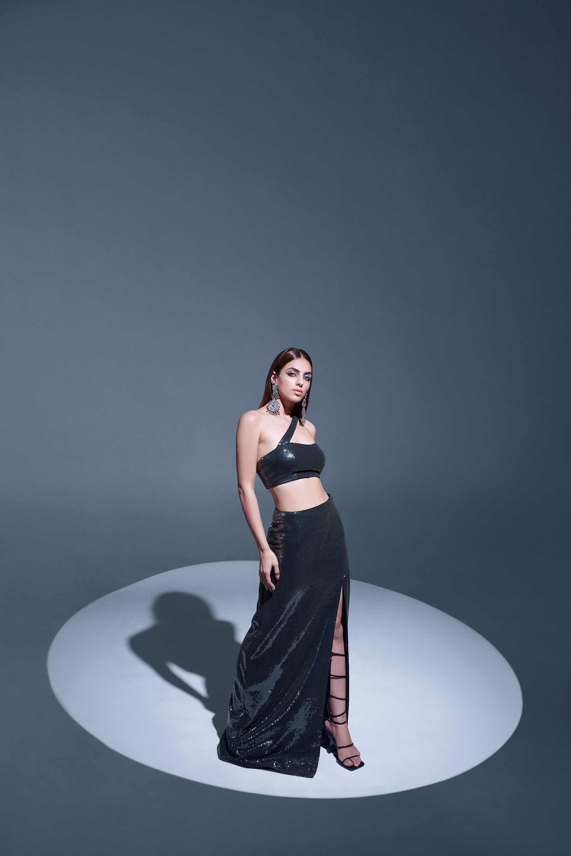 - The high-waisted skirt features a high slit, perfect for a cocktail evening.
