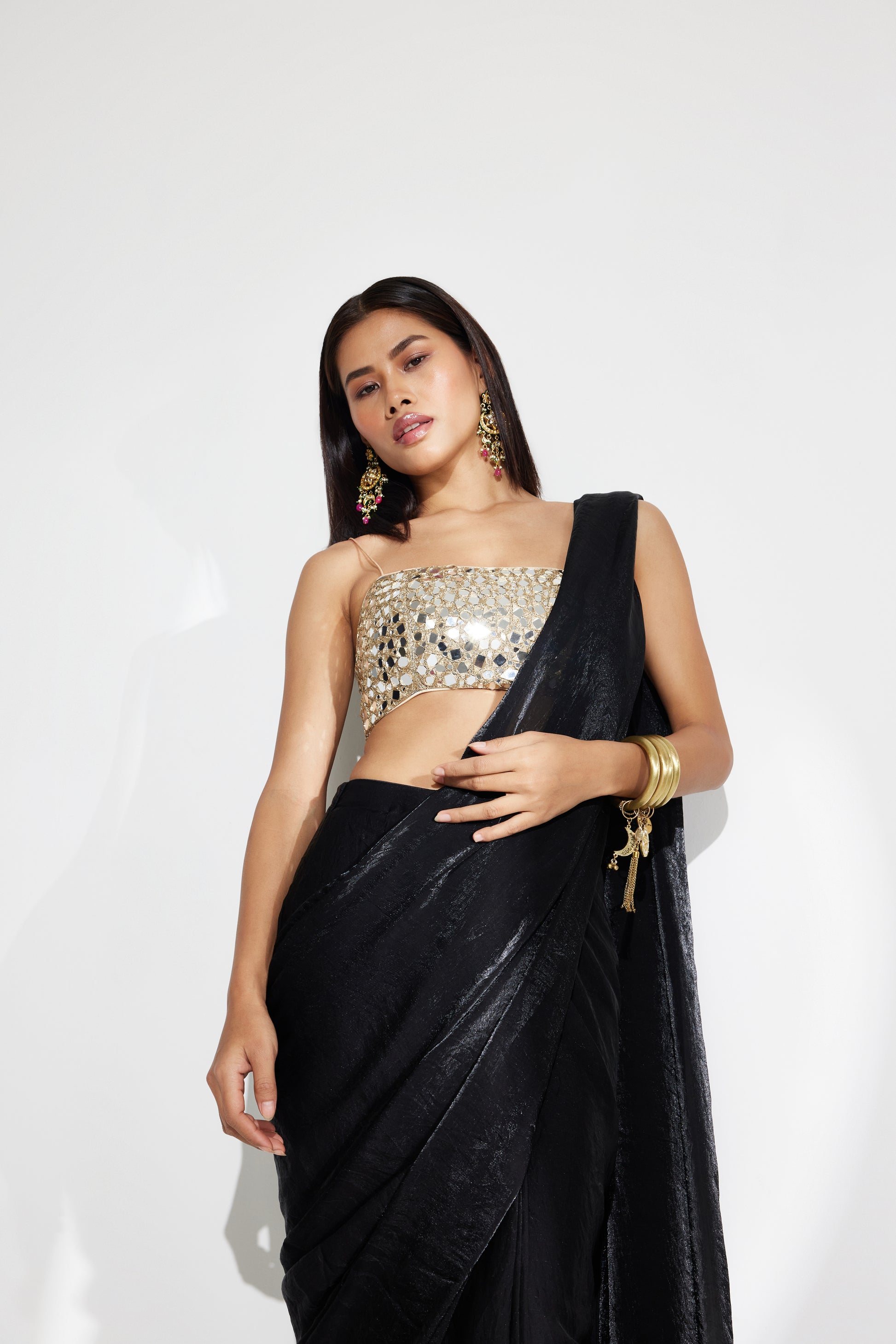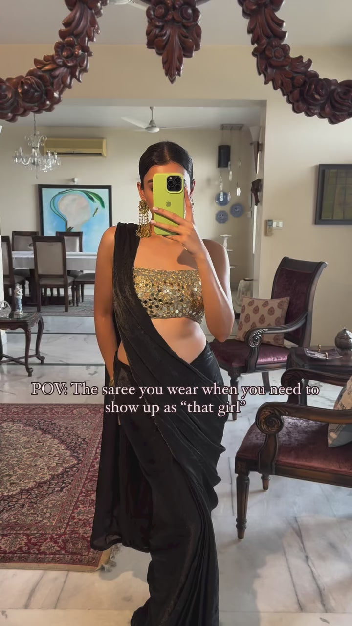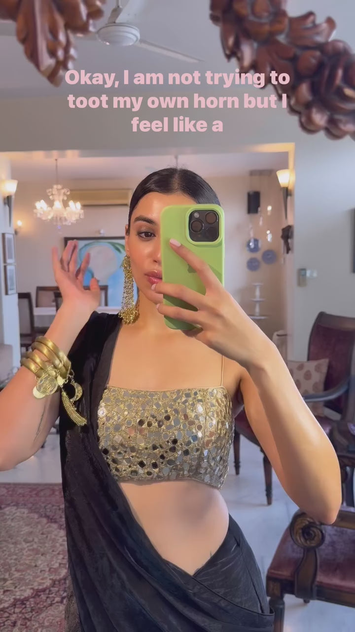 - Pre-draped black saree with a hand embroidered mirror work blouse