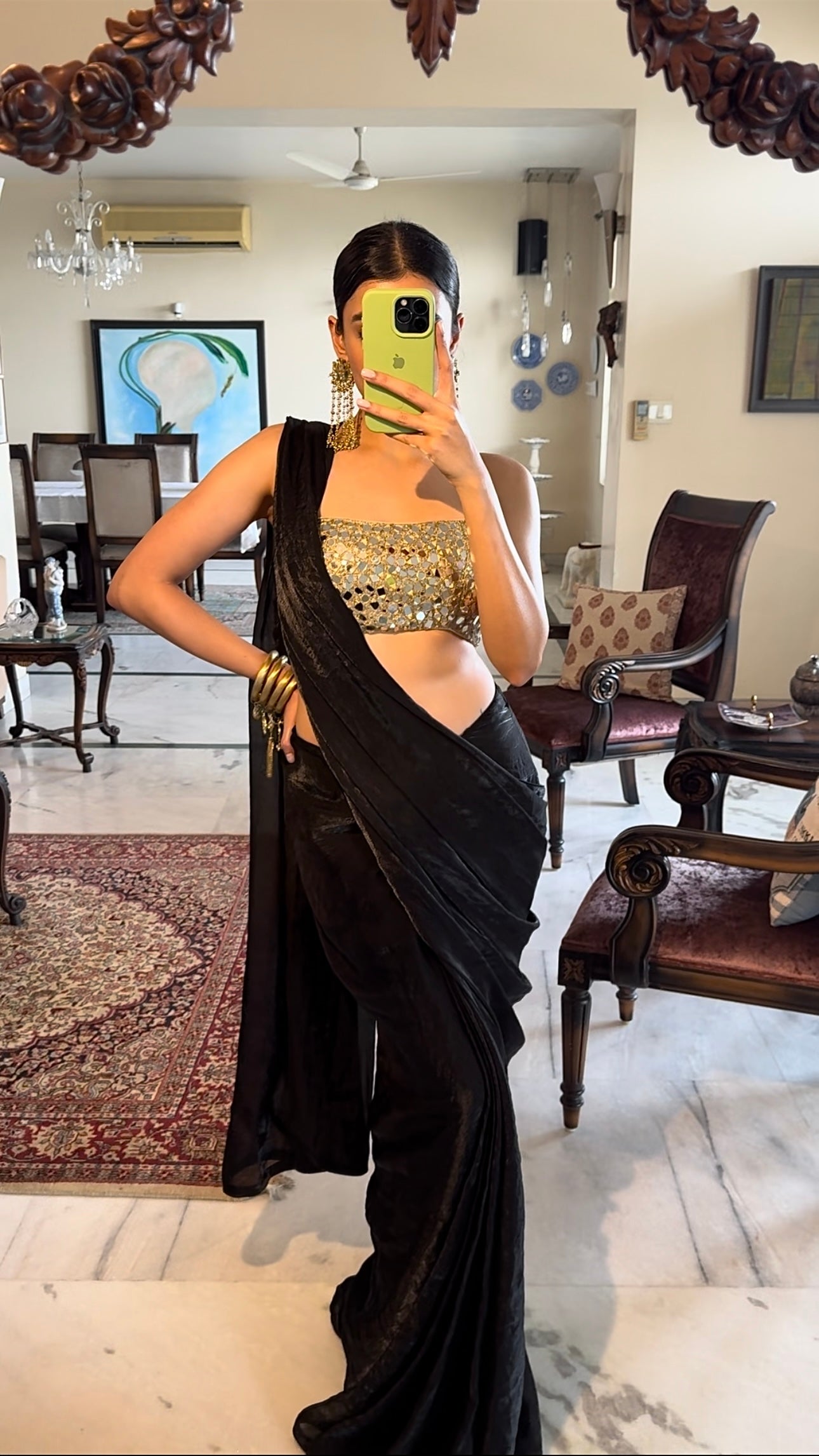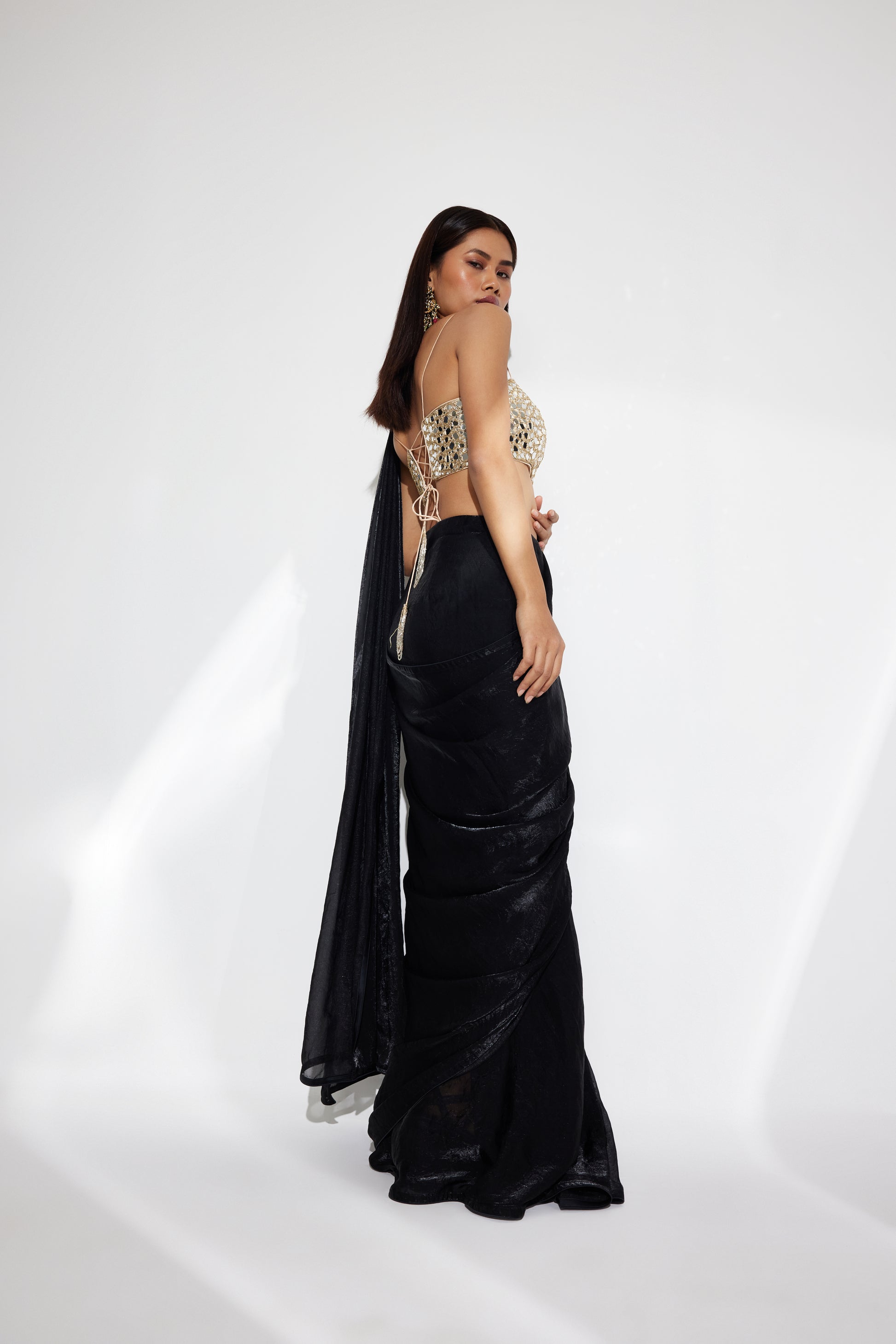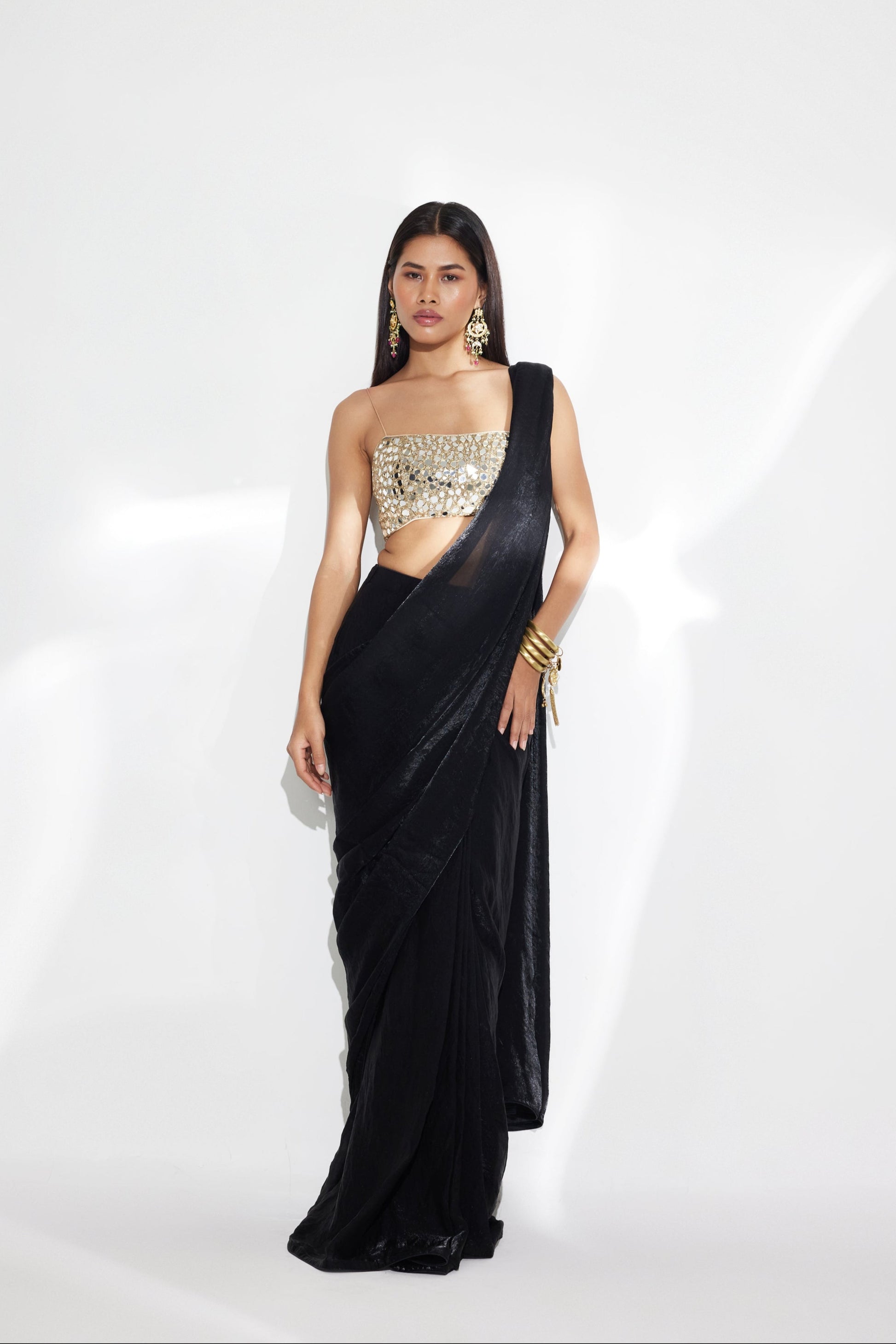 - Pre-draped black saree with a hand embroidered mirror work blouse