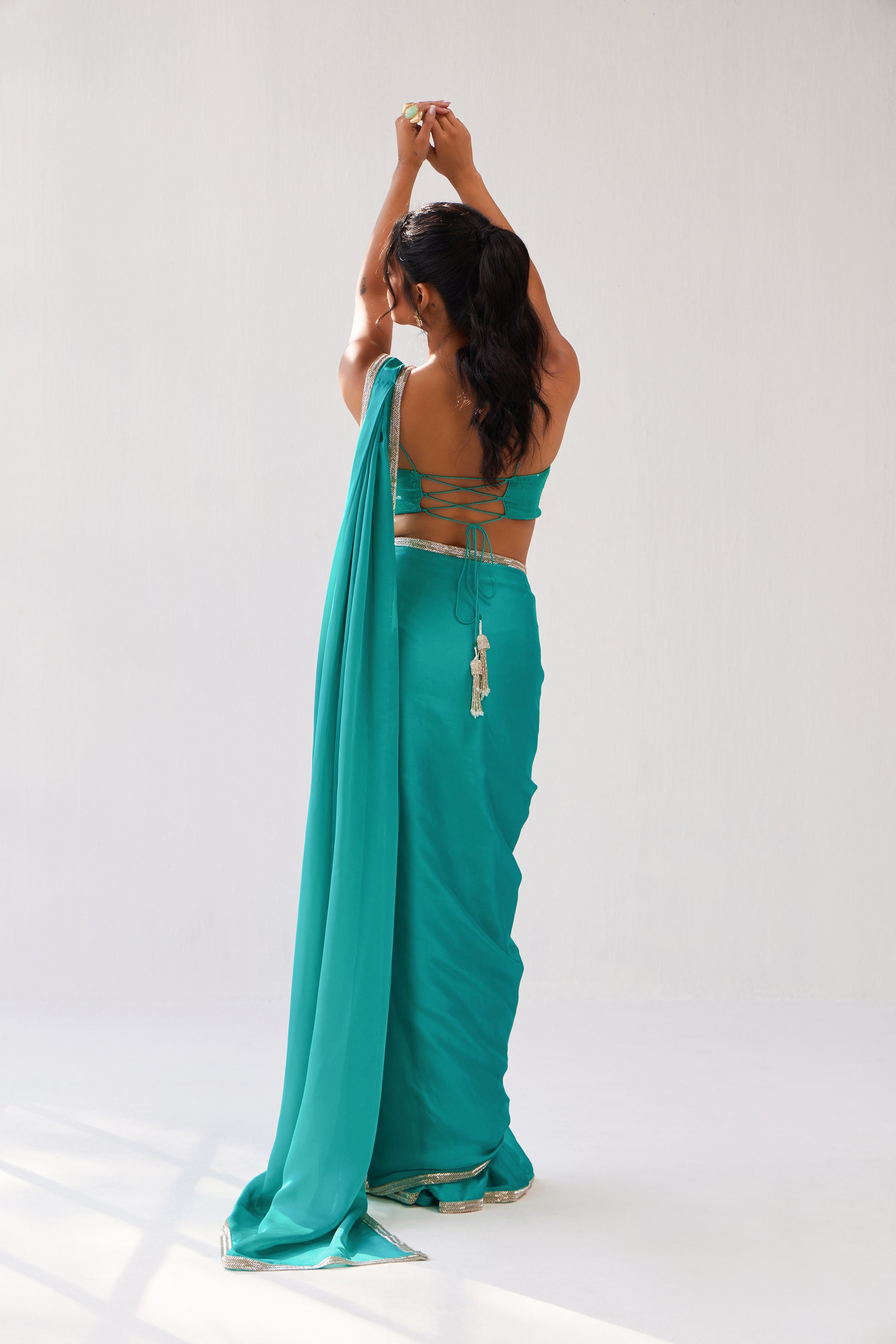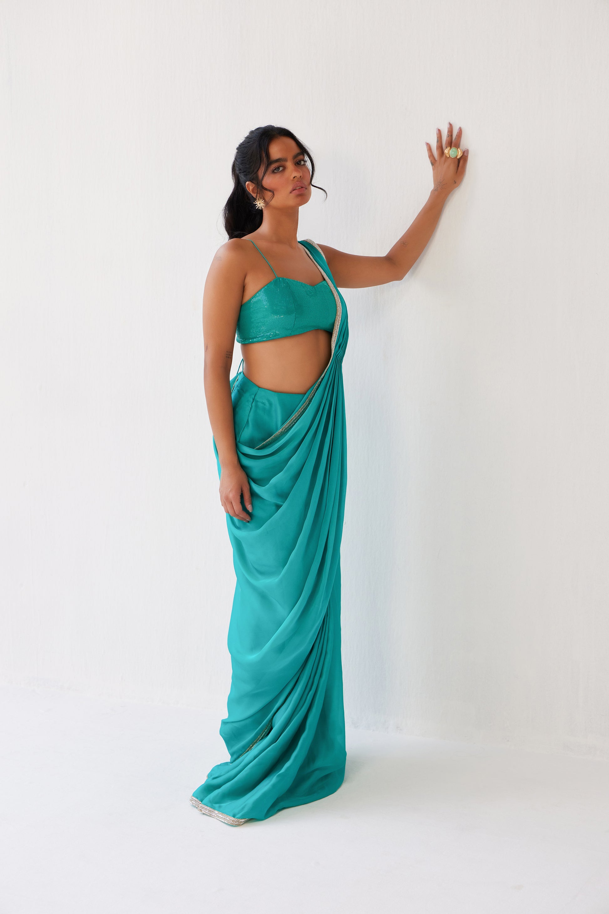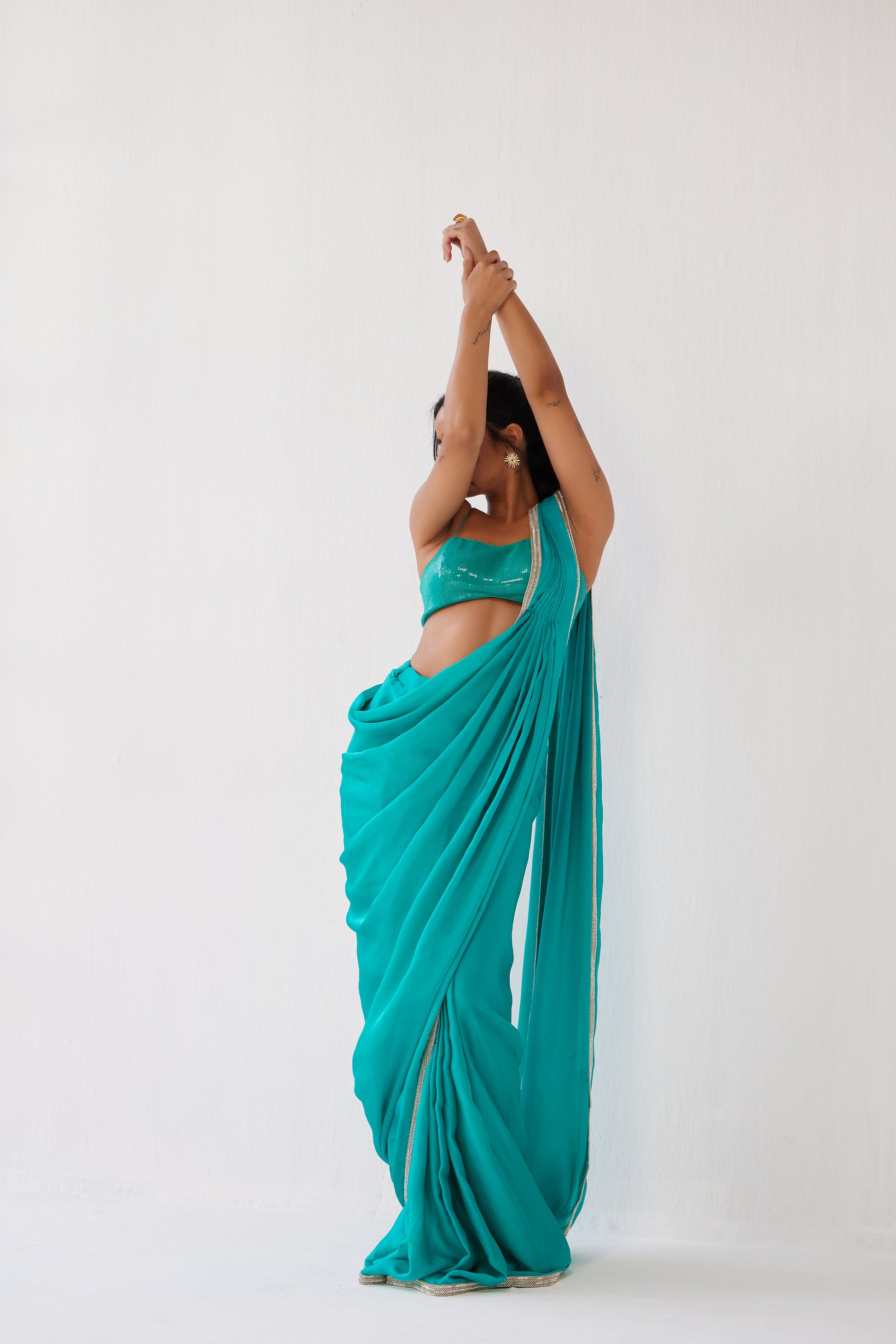 - A beautiful turquoise blue georgette-satin saree with a sequin blouse