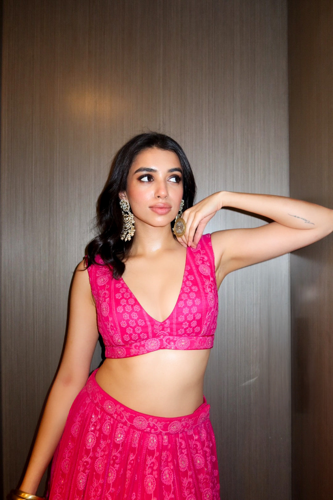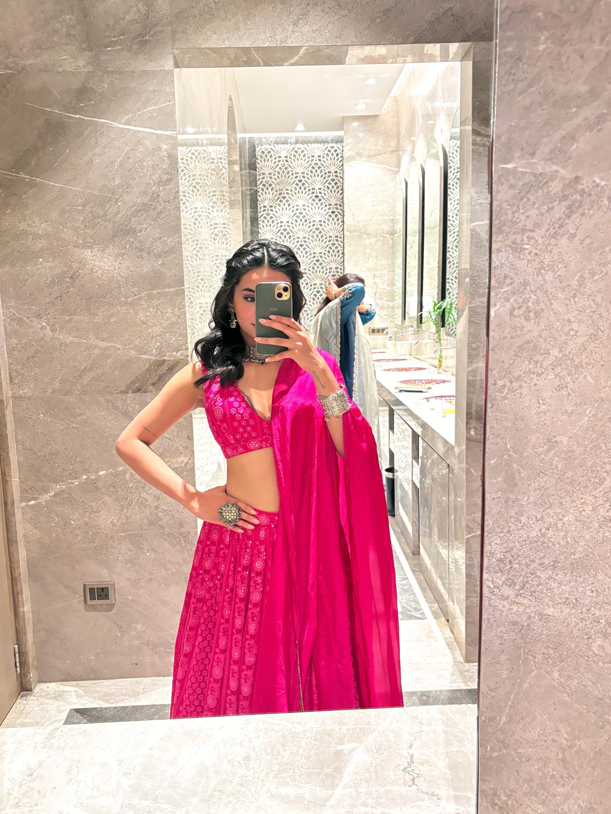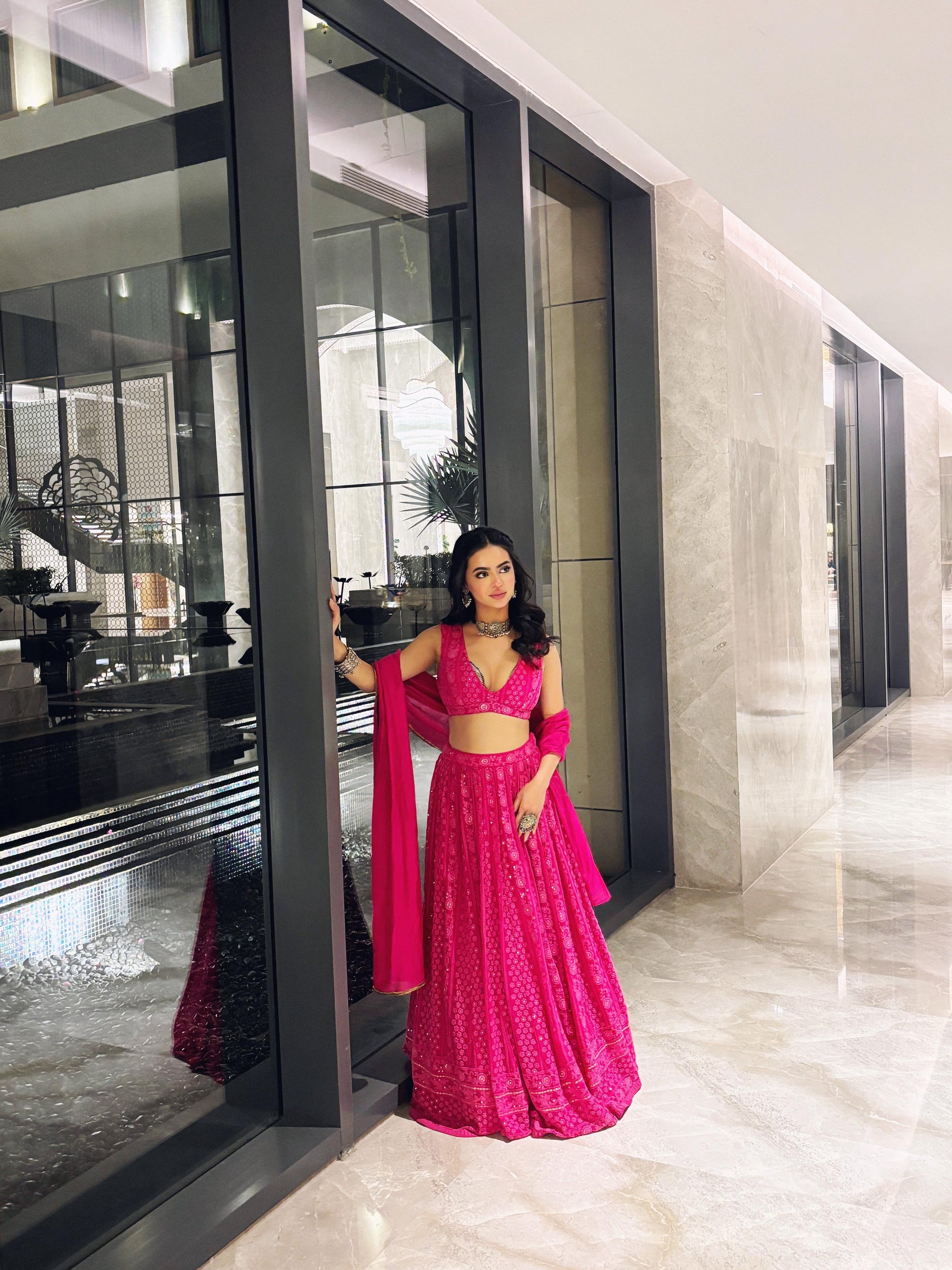 - Hot pink lehenga set featuring machine embroidery on georgette.