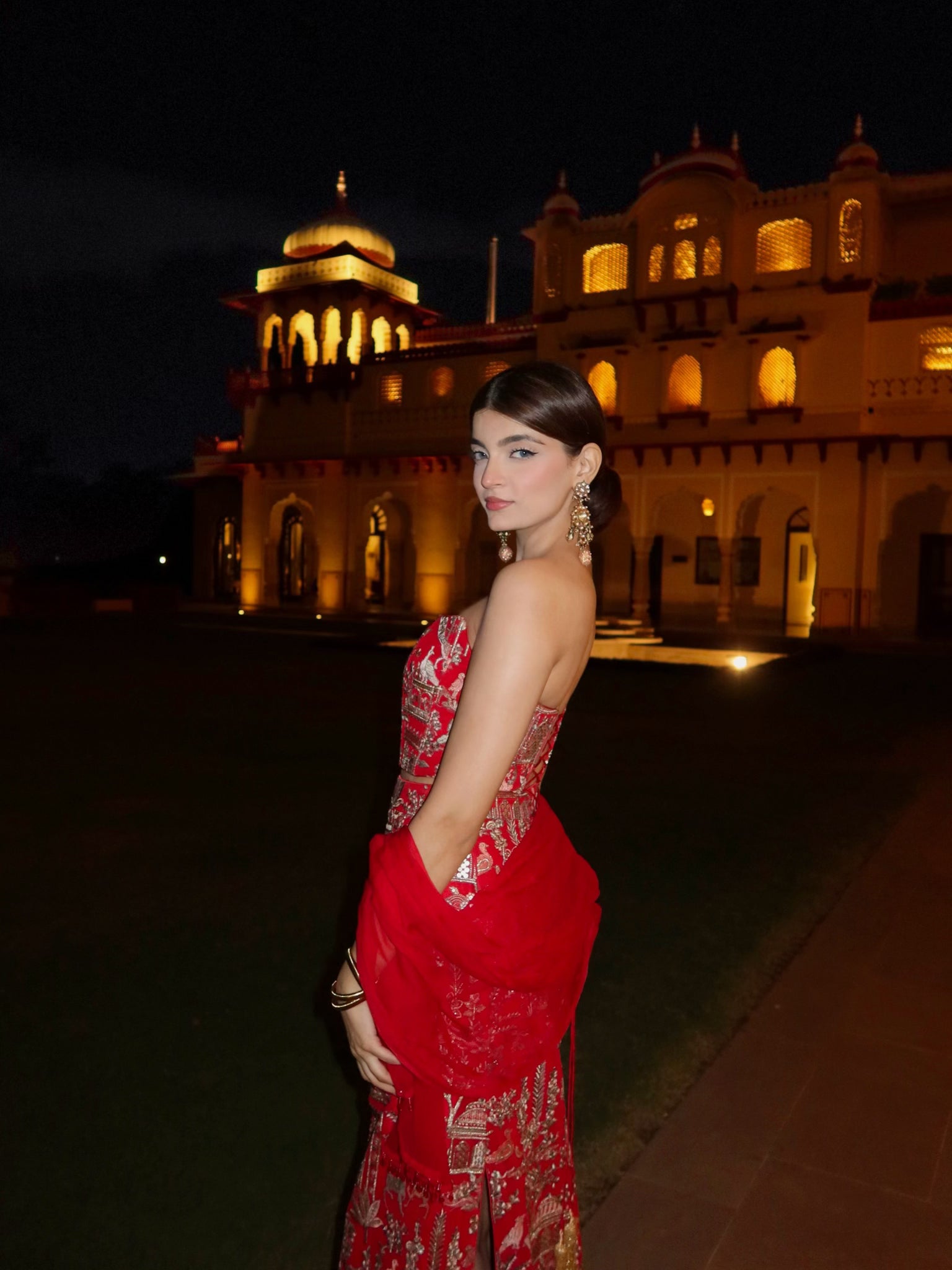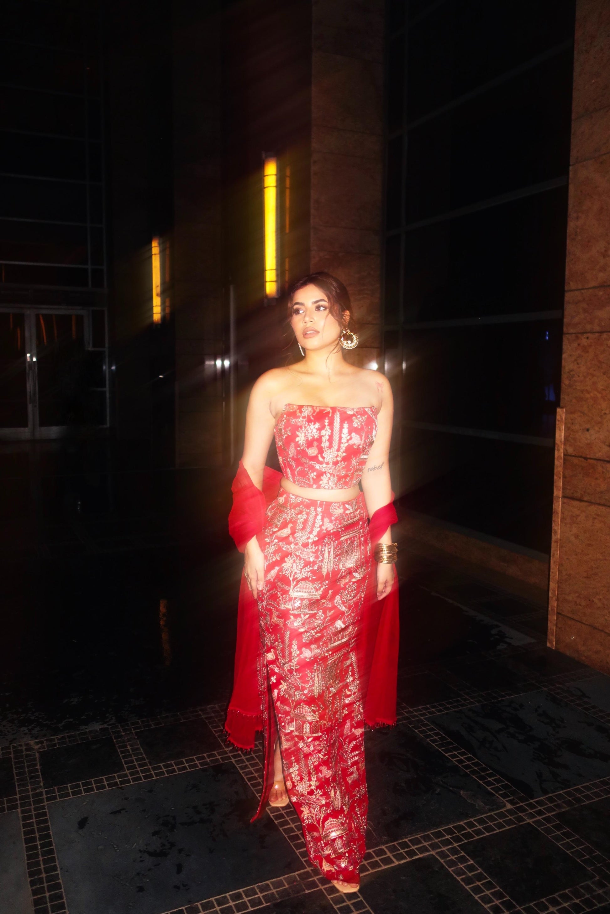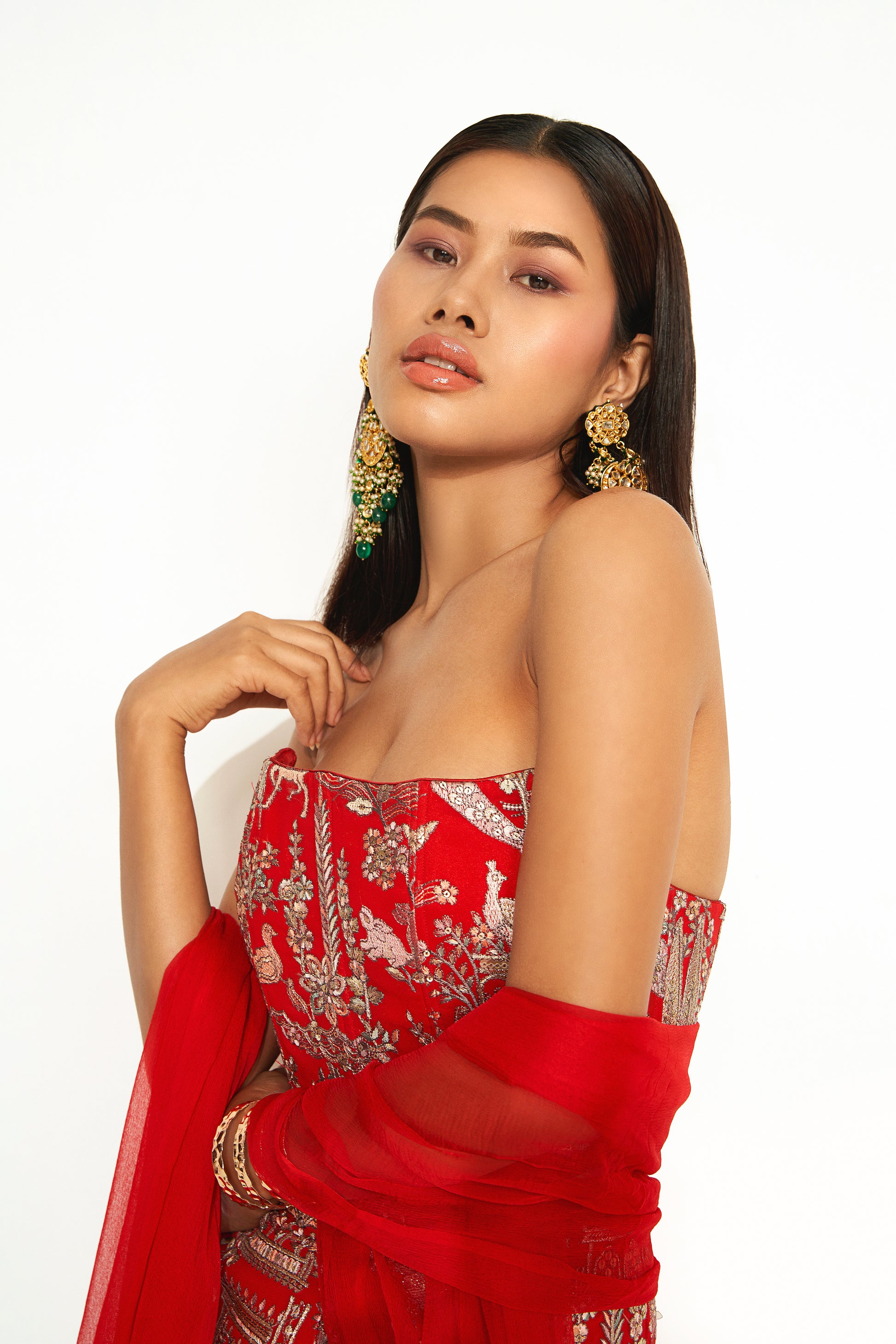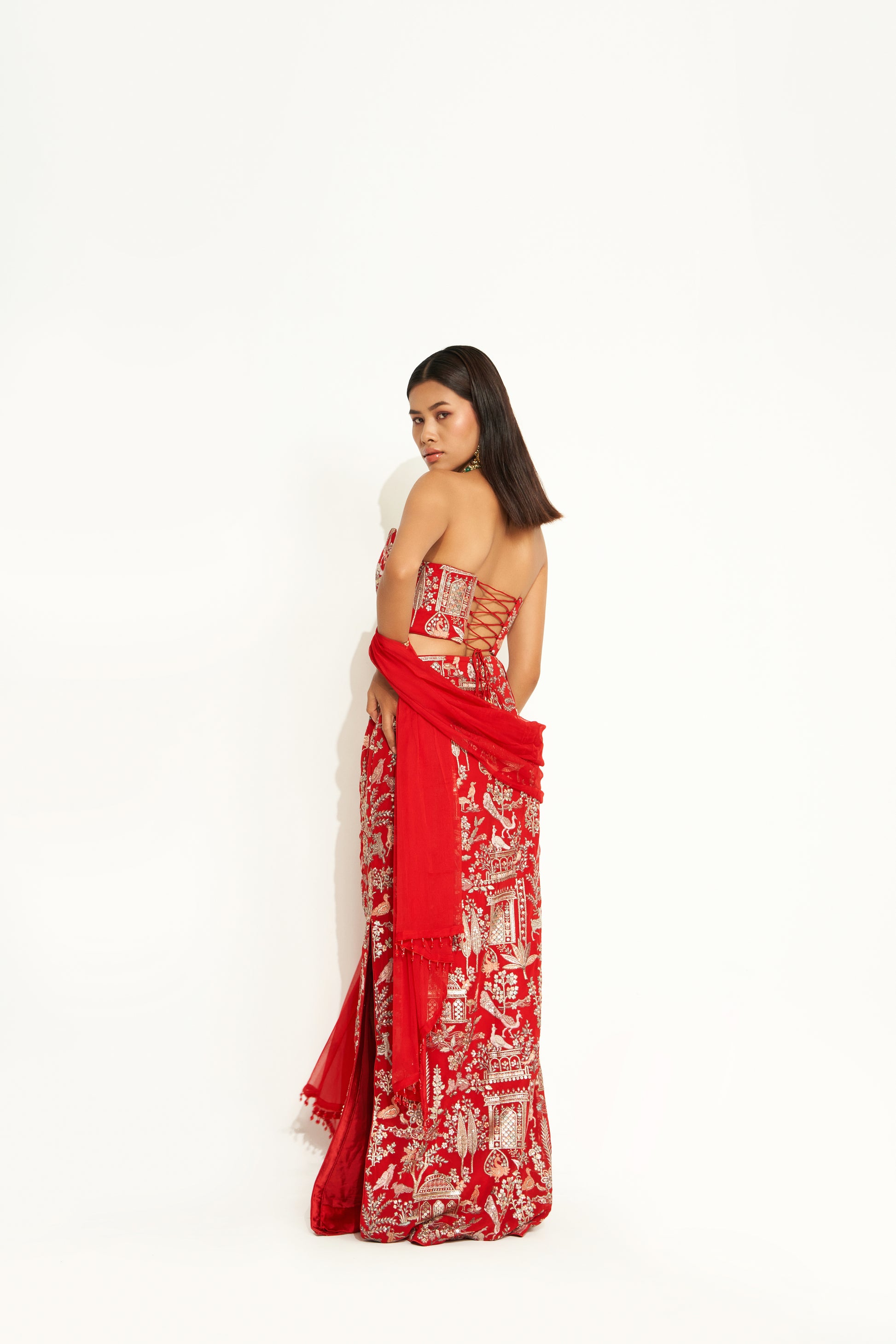 - Red corset and straight skirt set featuring intricate embroidery on georgette.