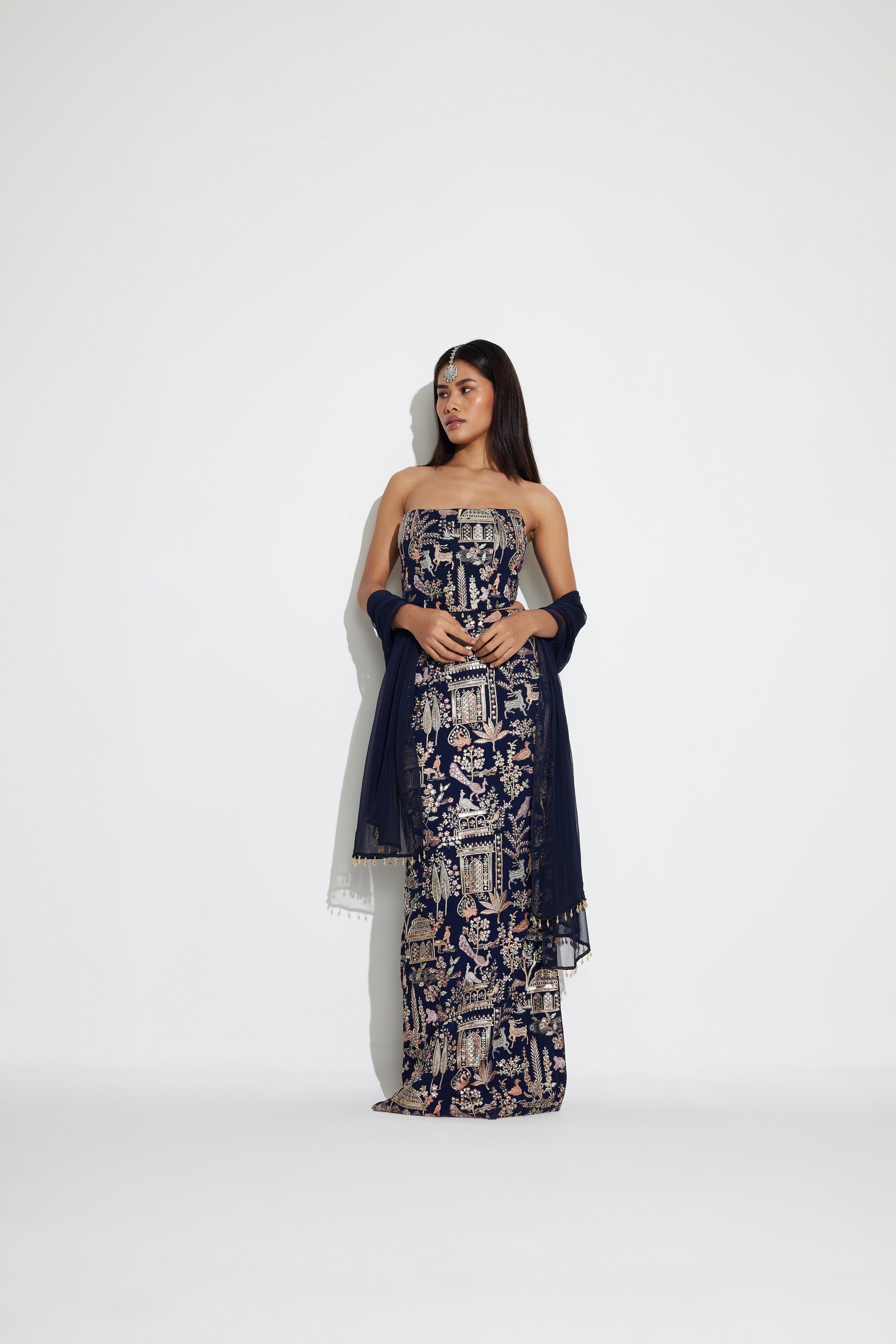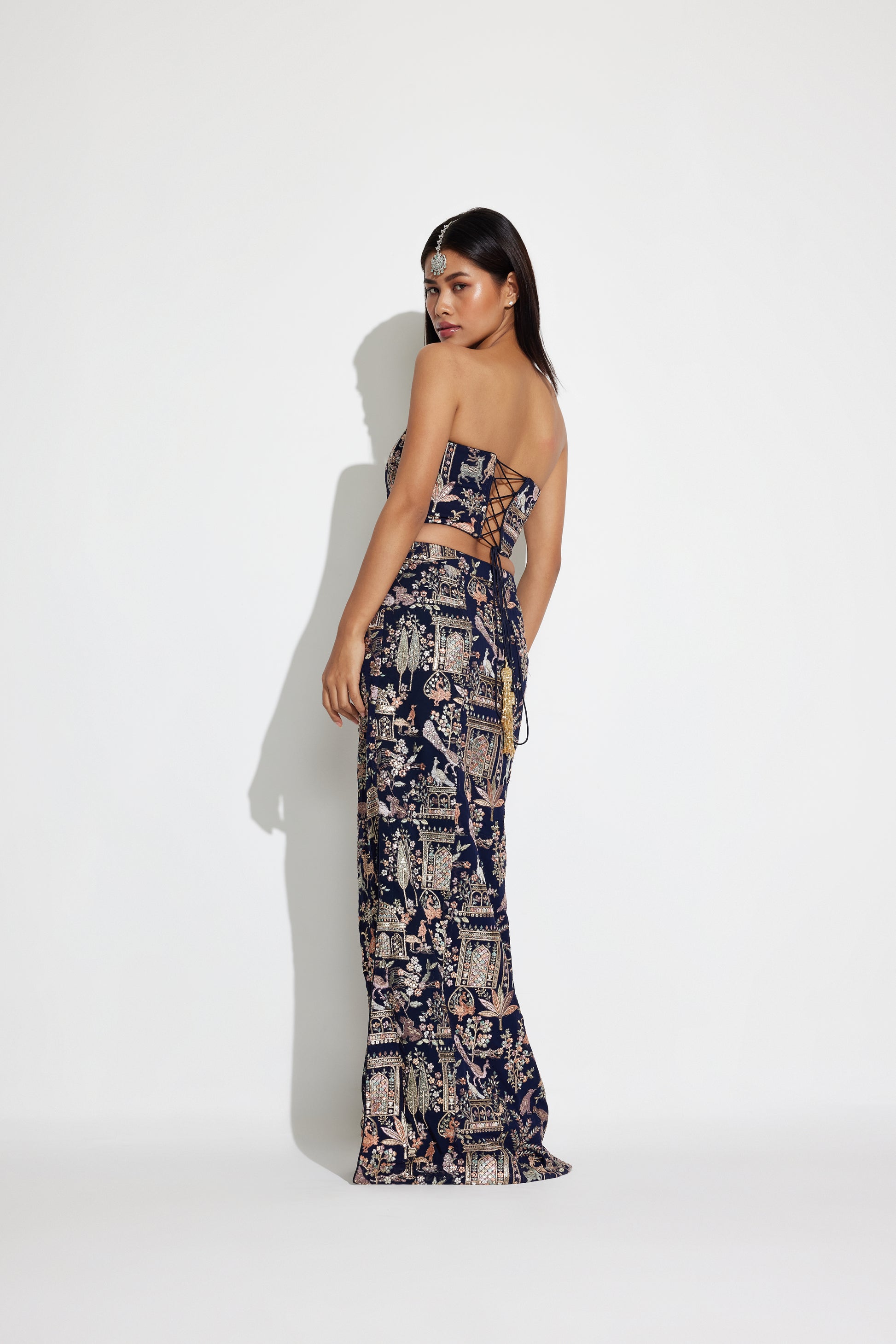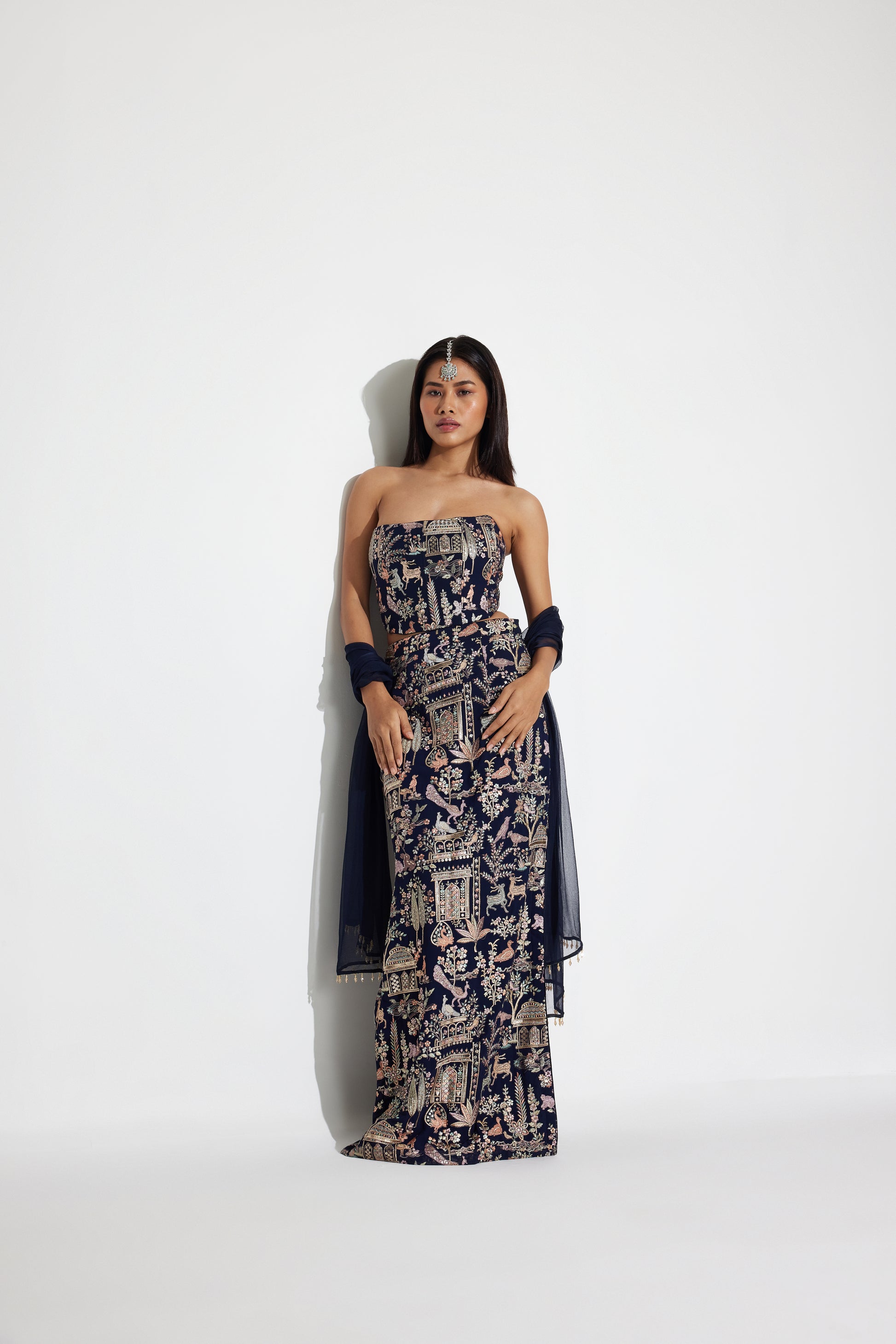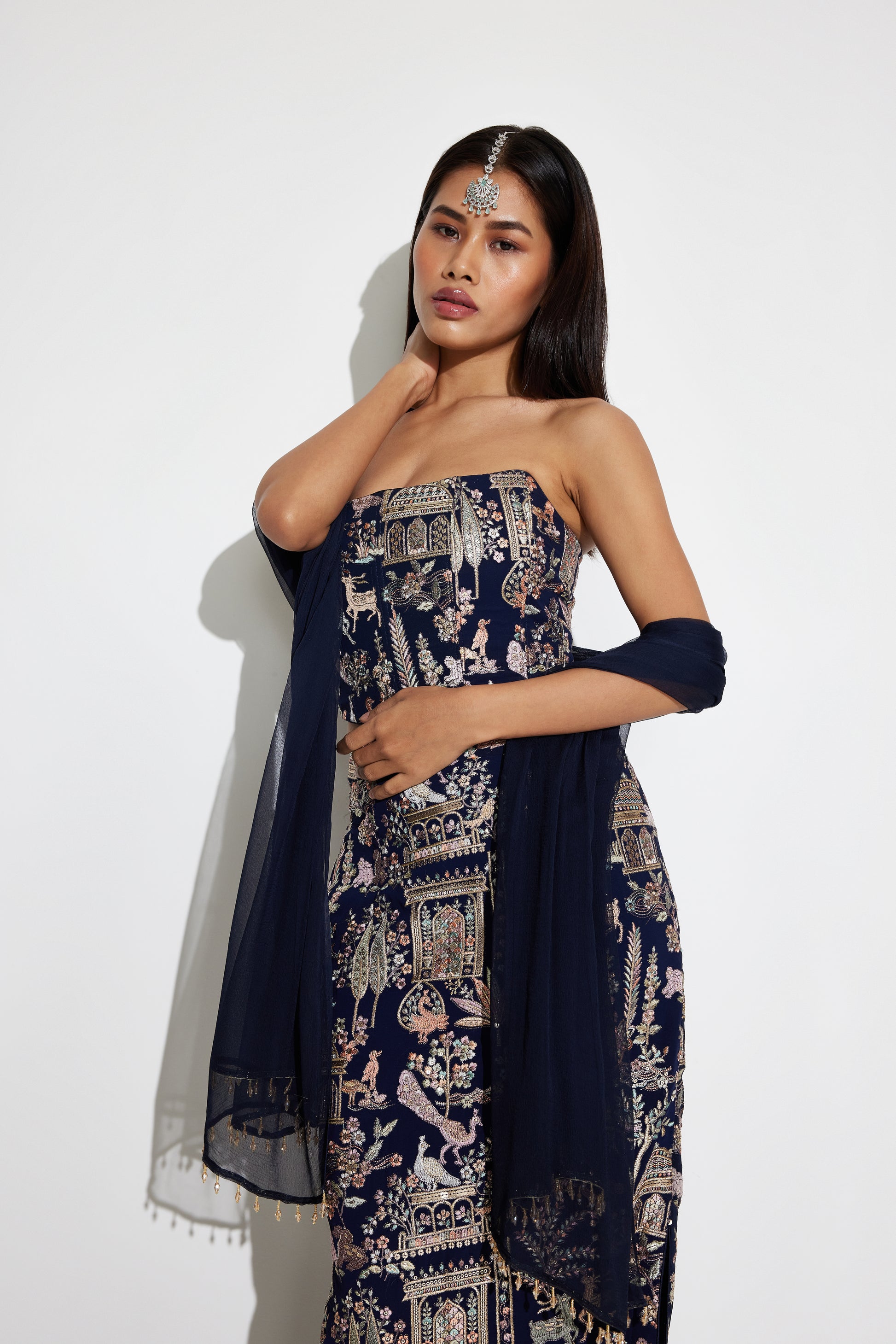 - Navy blue corset and straight skirt set featuring intricate embroidery on georgette.