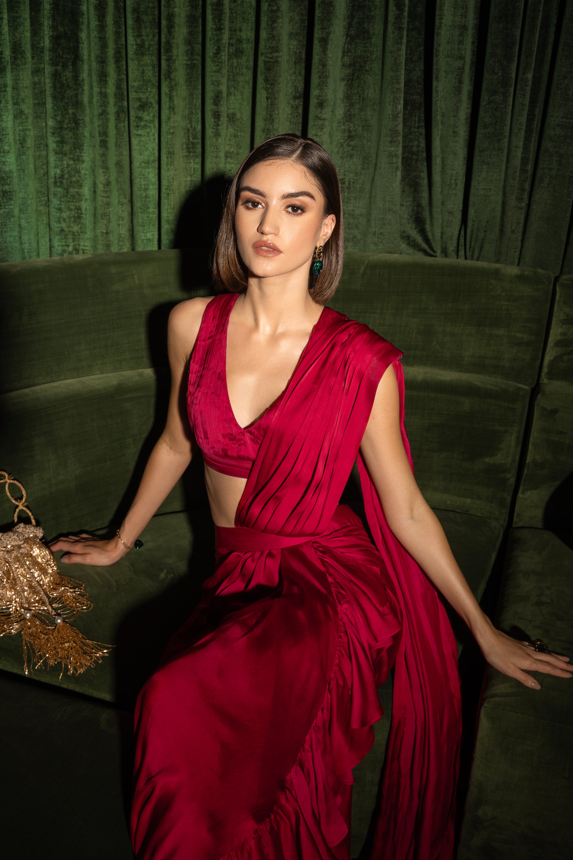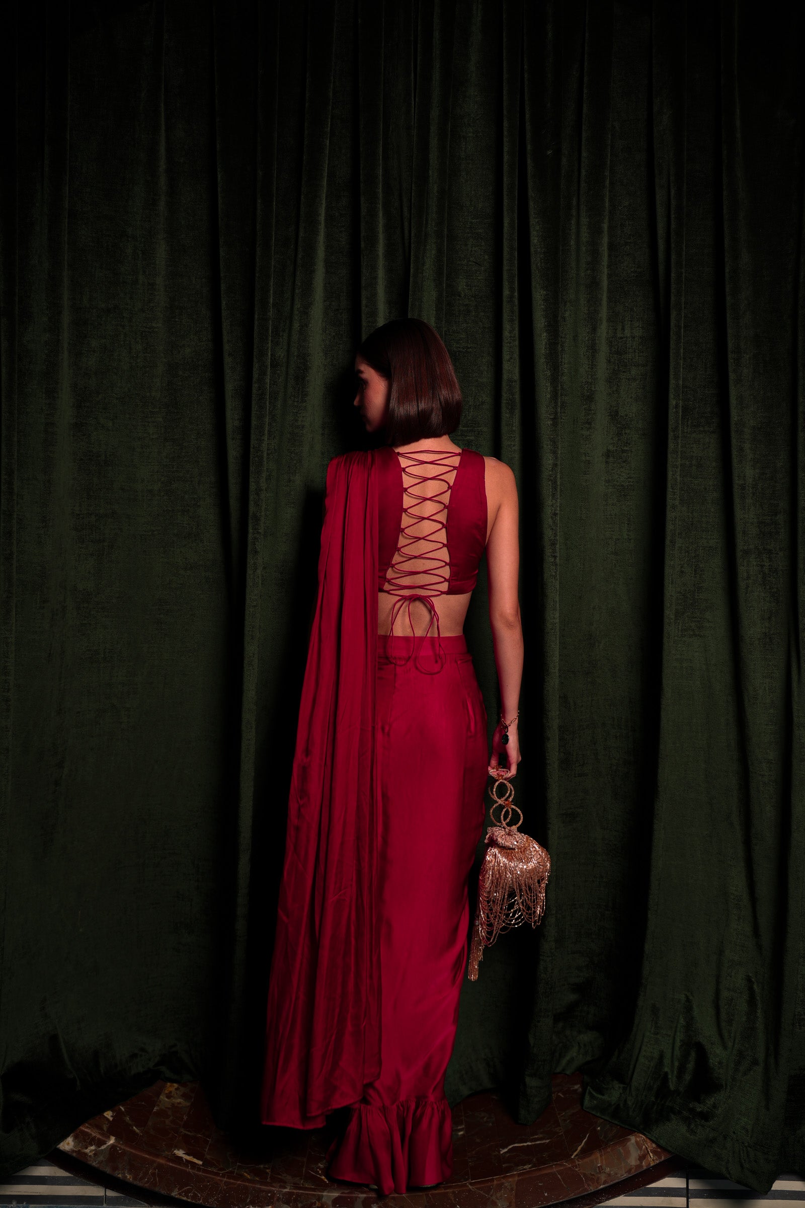 - The blouse includes a plunging neckline and drawstrings at the back for you to adjust the fit. The blouse also features a delicate pleating effect.