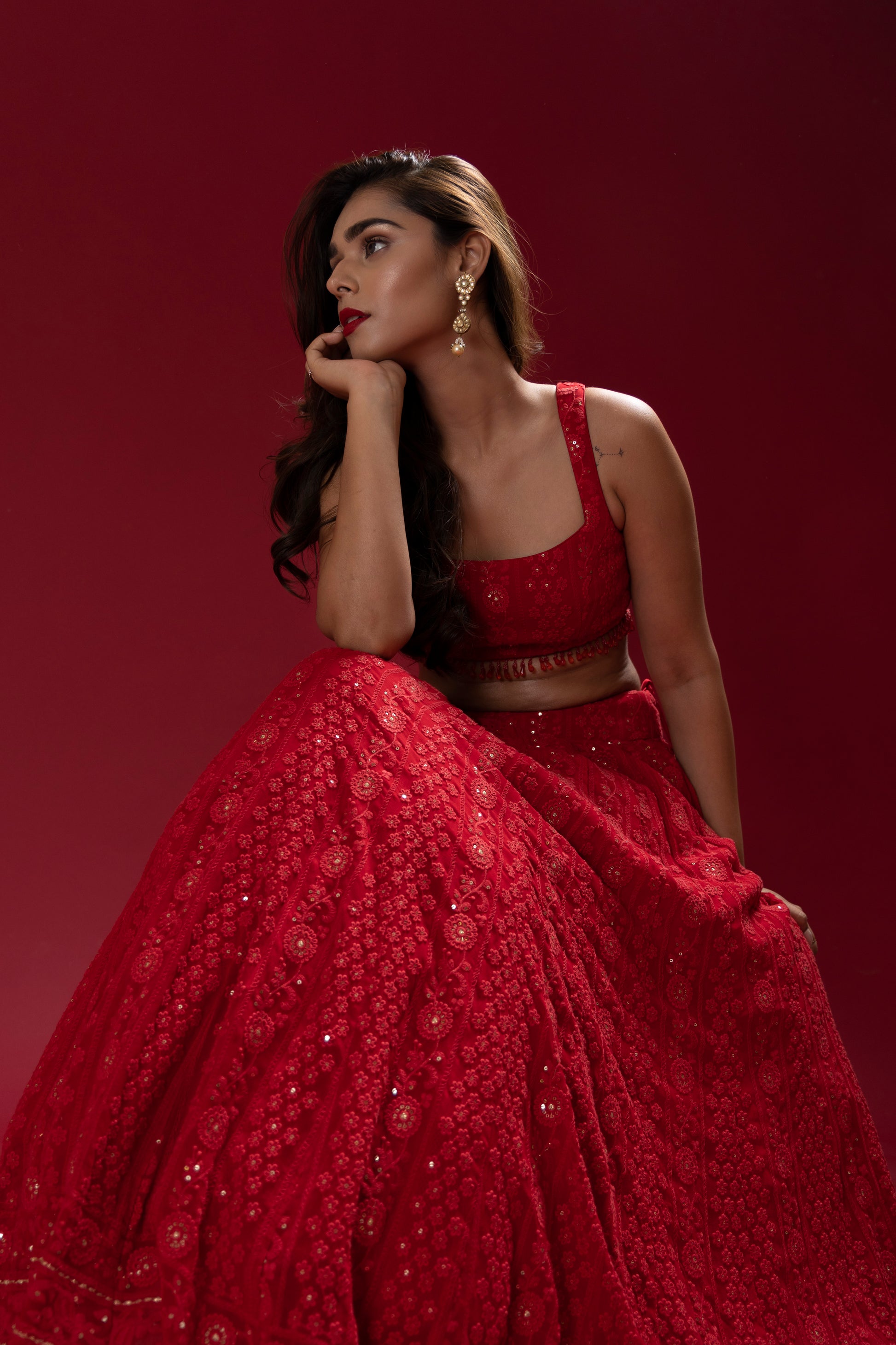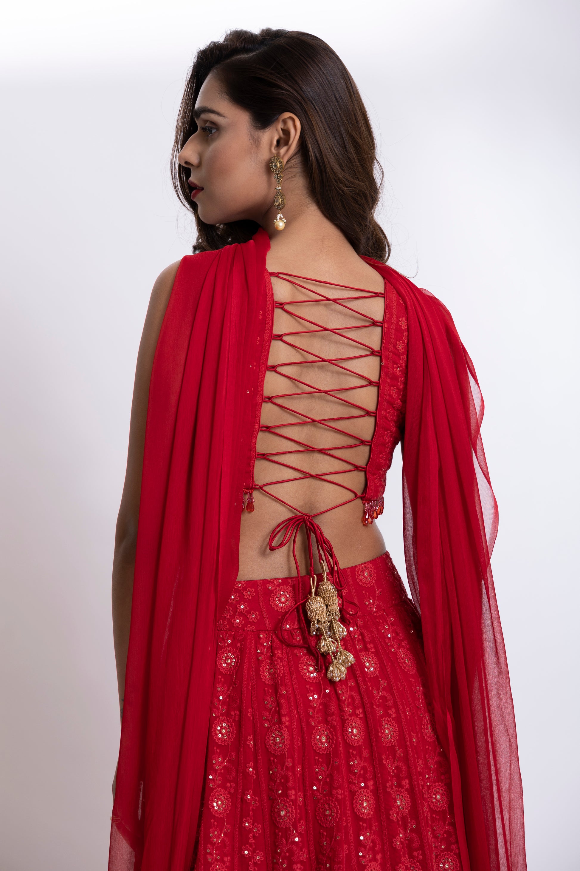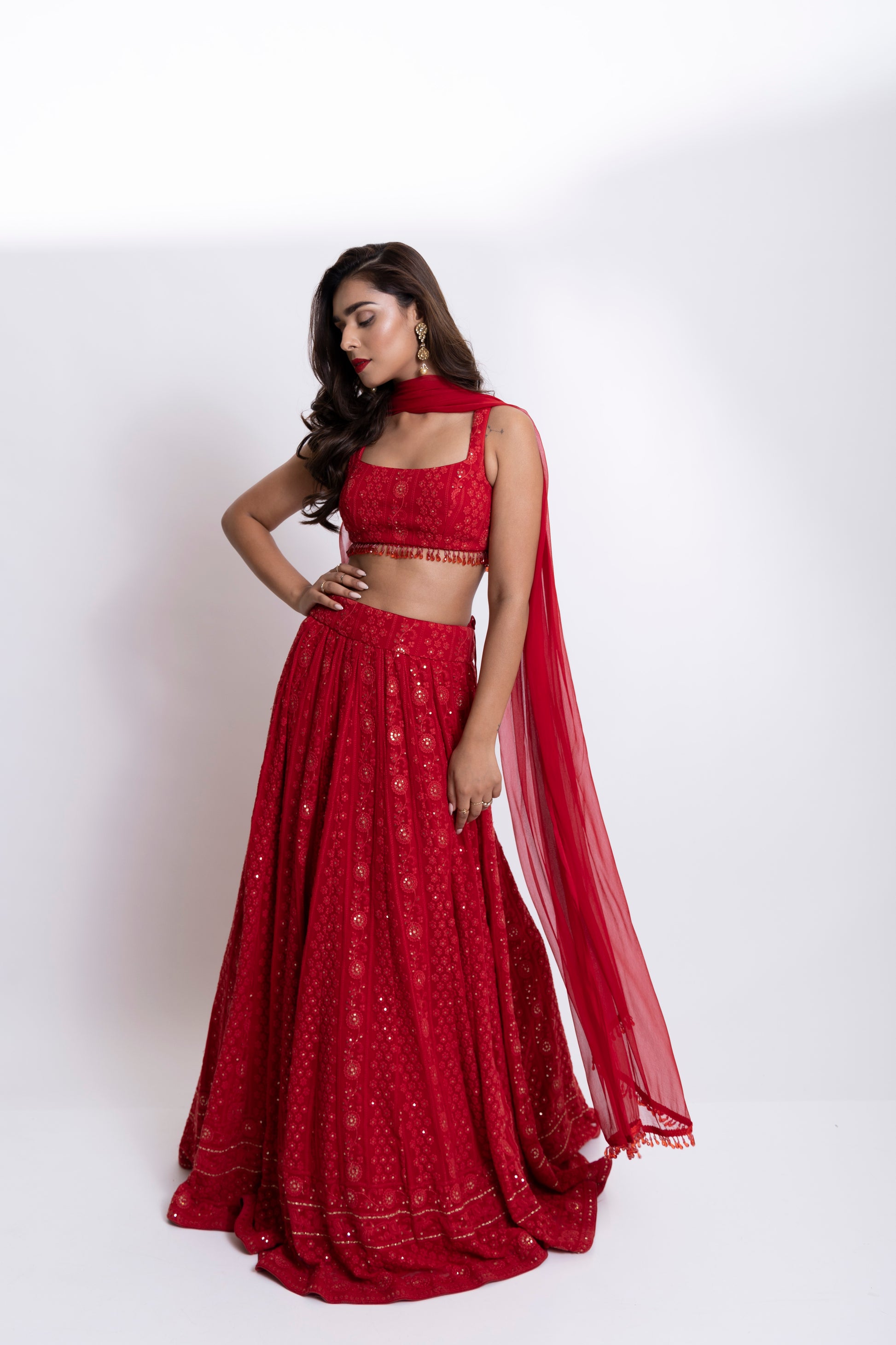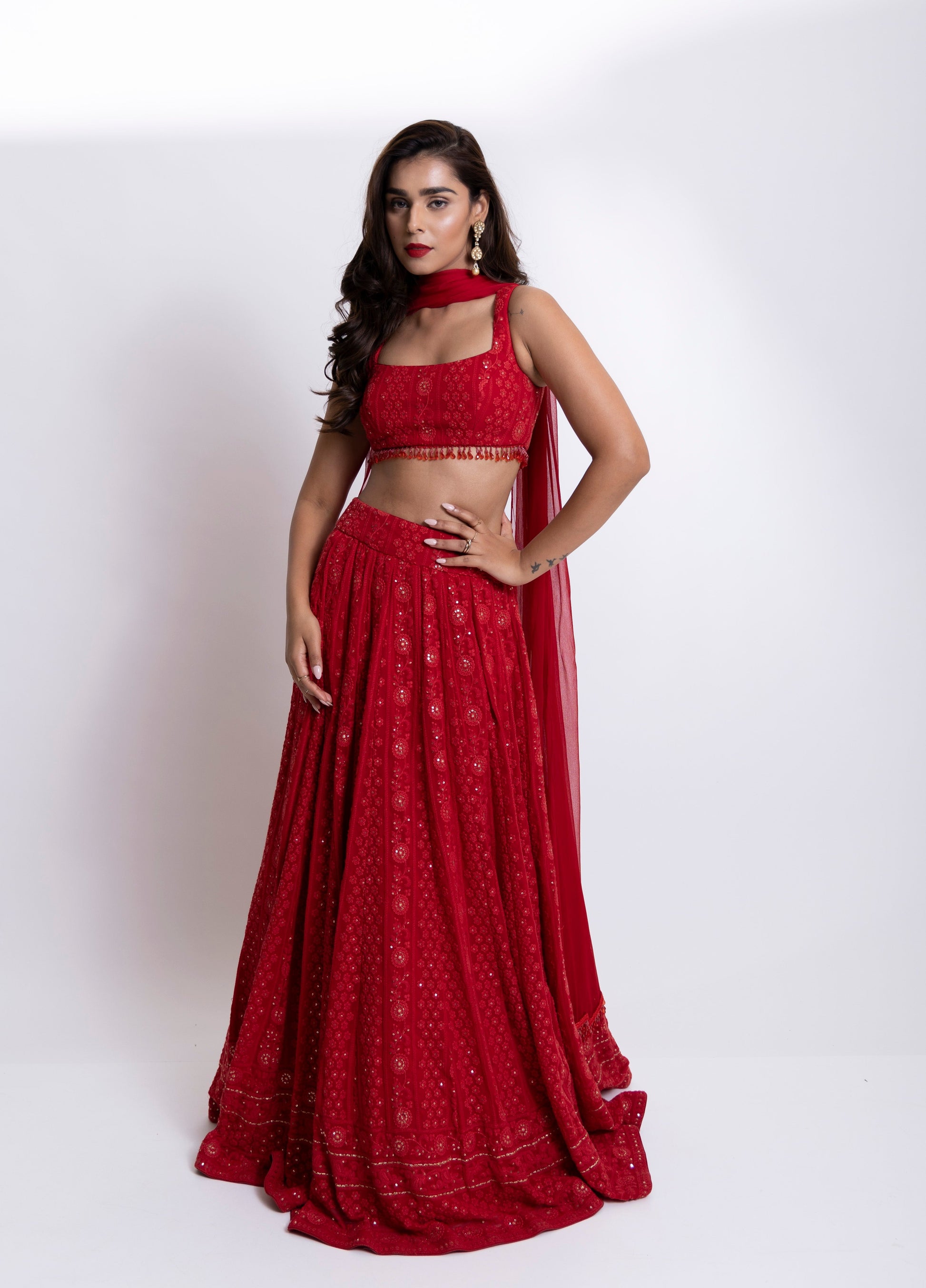 - Crimson red lehenga set featuring machine embroidery on georgette.