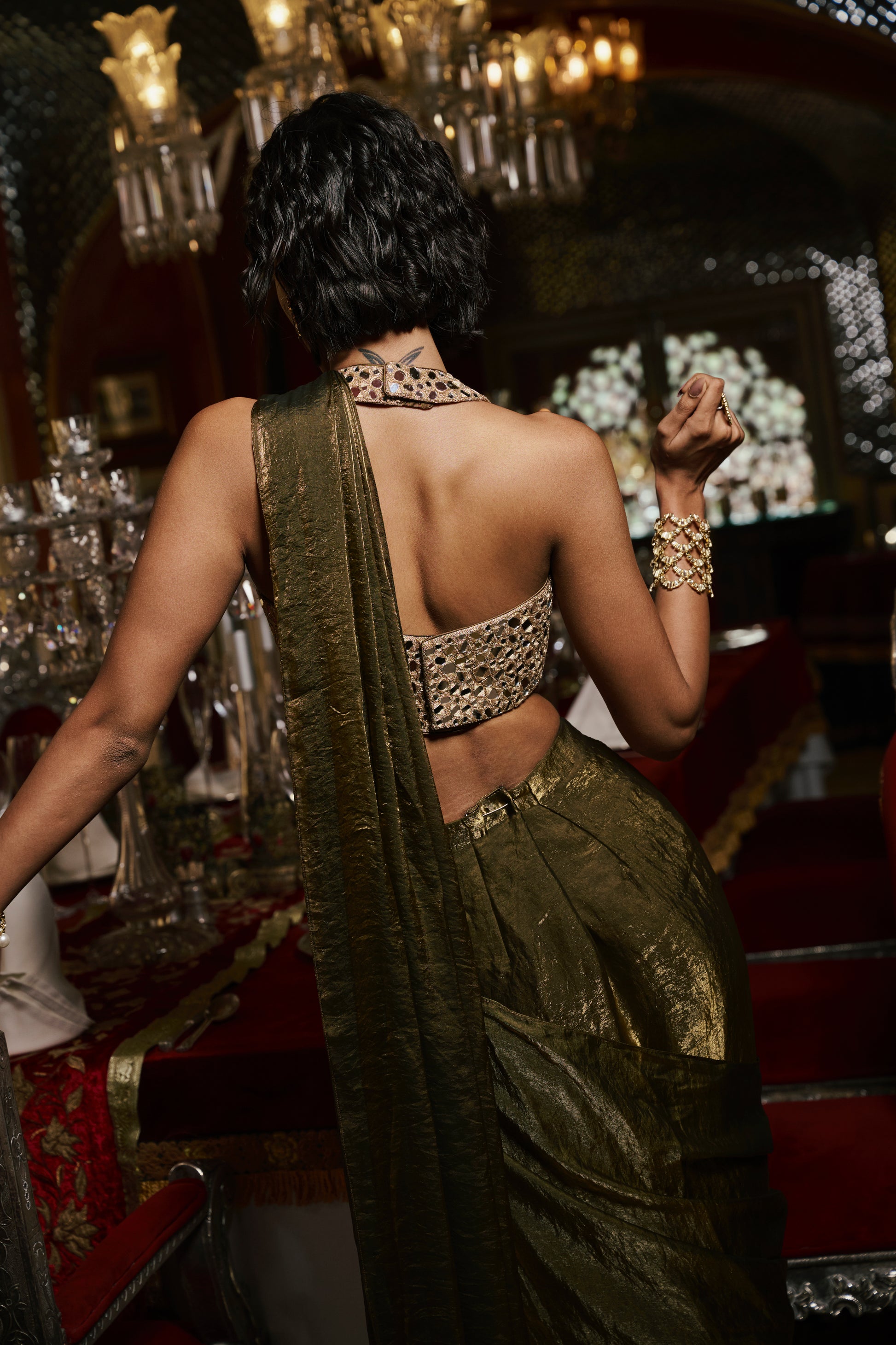 - Pre-draped bronze saree with a hand-embroidered mirror work blouse