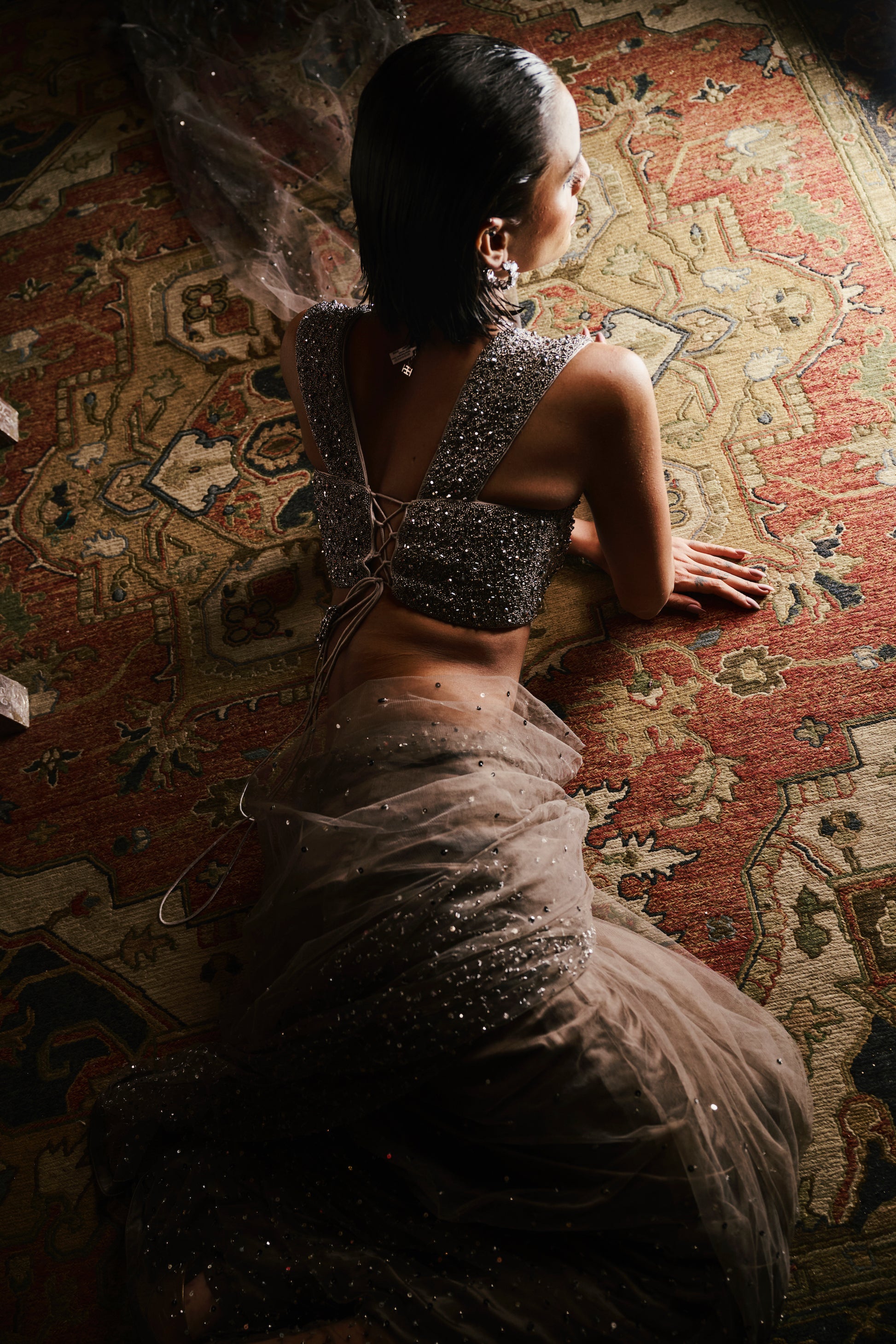 - The saree features cheeta embroidery using black, grey and silver glass beads and sequins. The blouse is entirely embellished using the same.