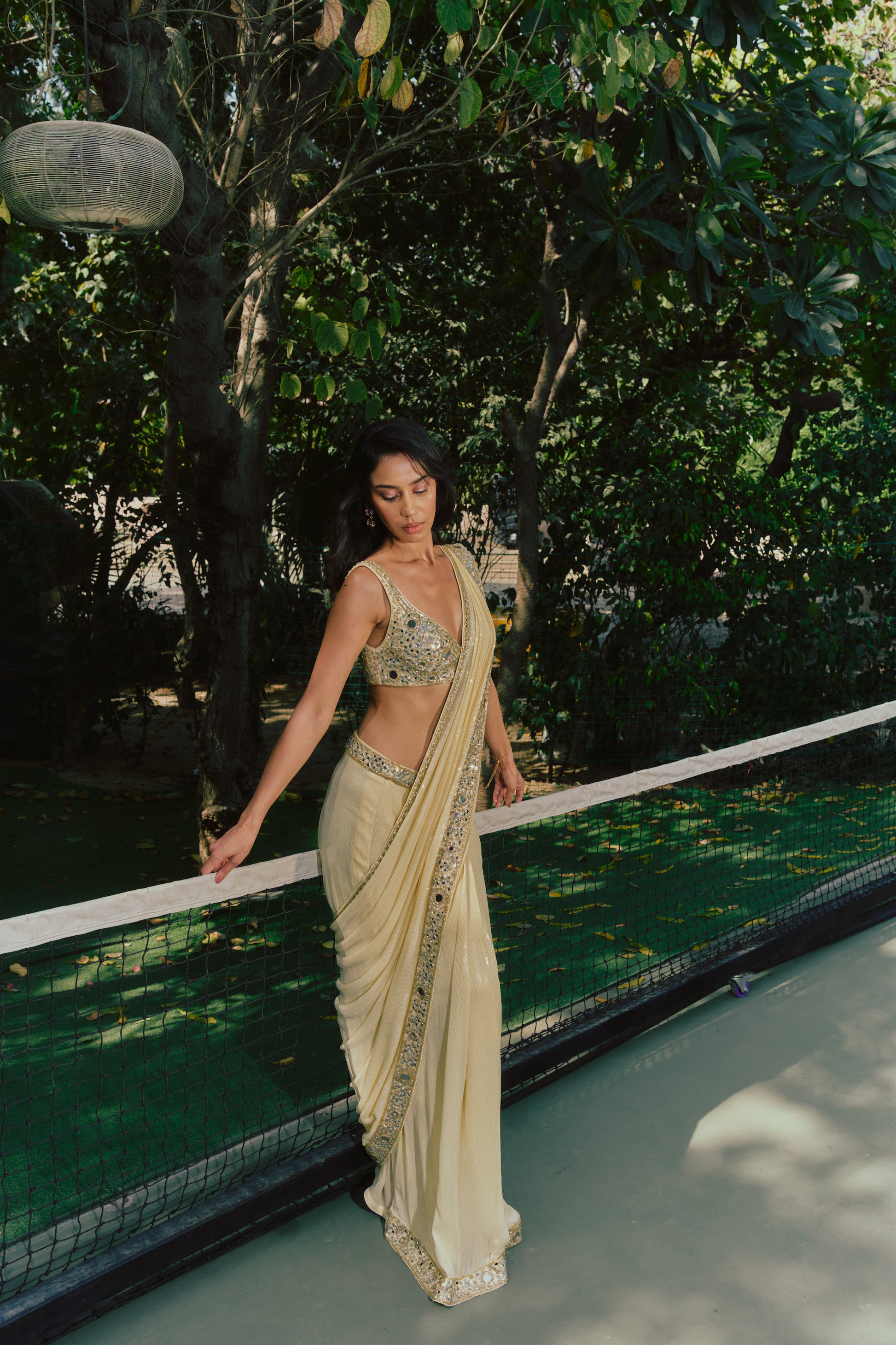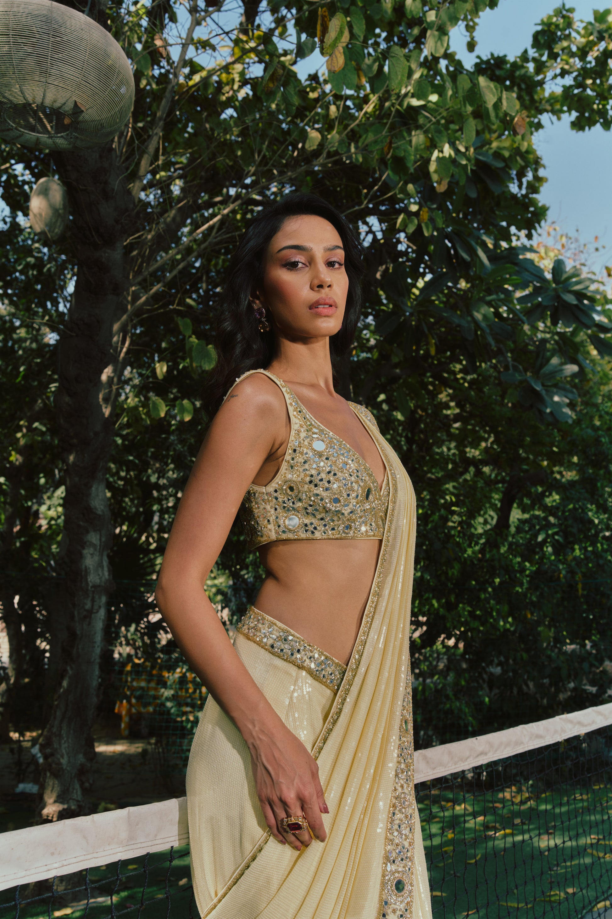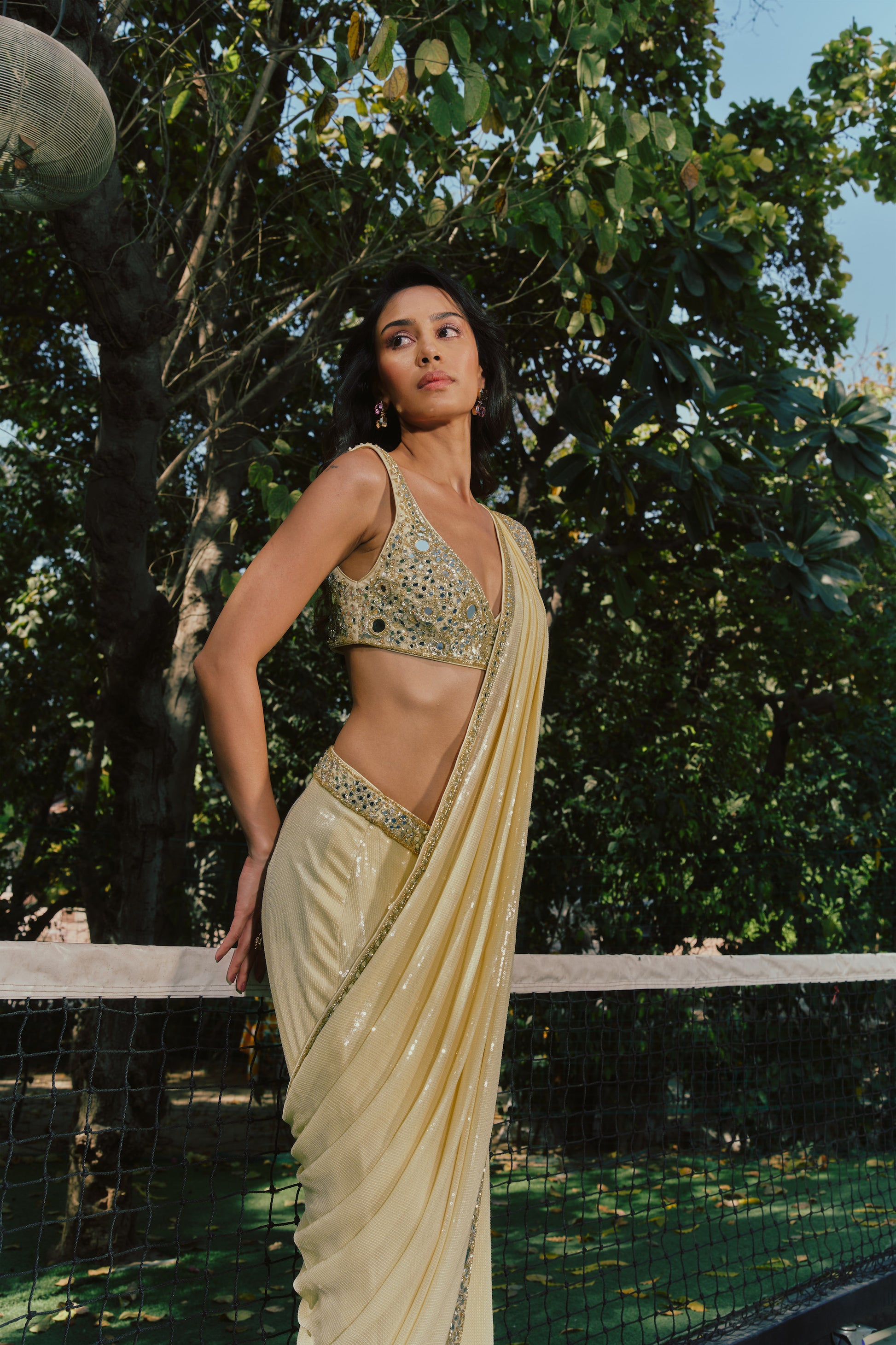 - A pre-draped sequin saree, designed for effortless wear and fluid movement. The silhouette is worn like a skirt, finished with a concealed side zip.