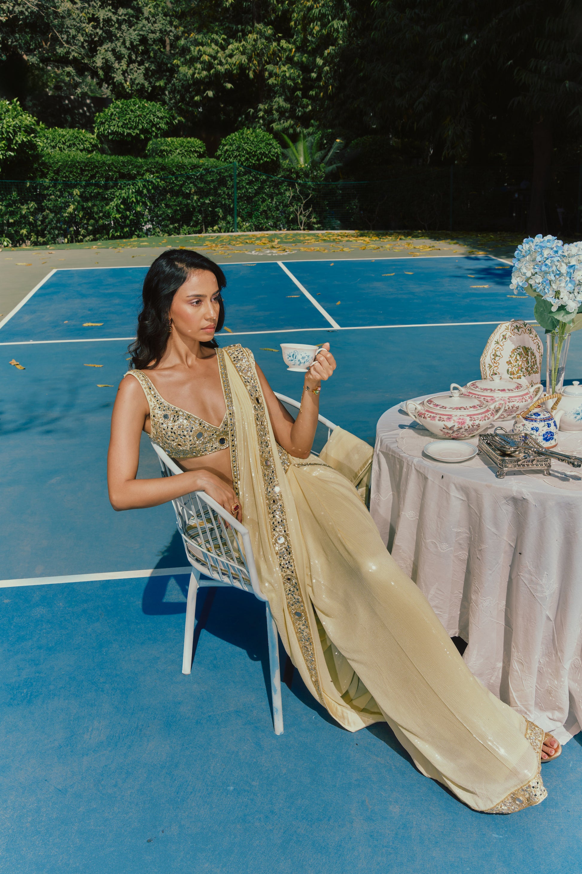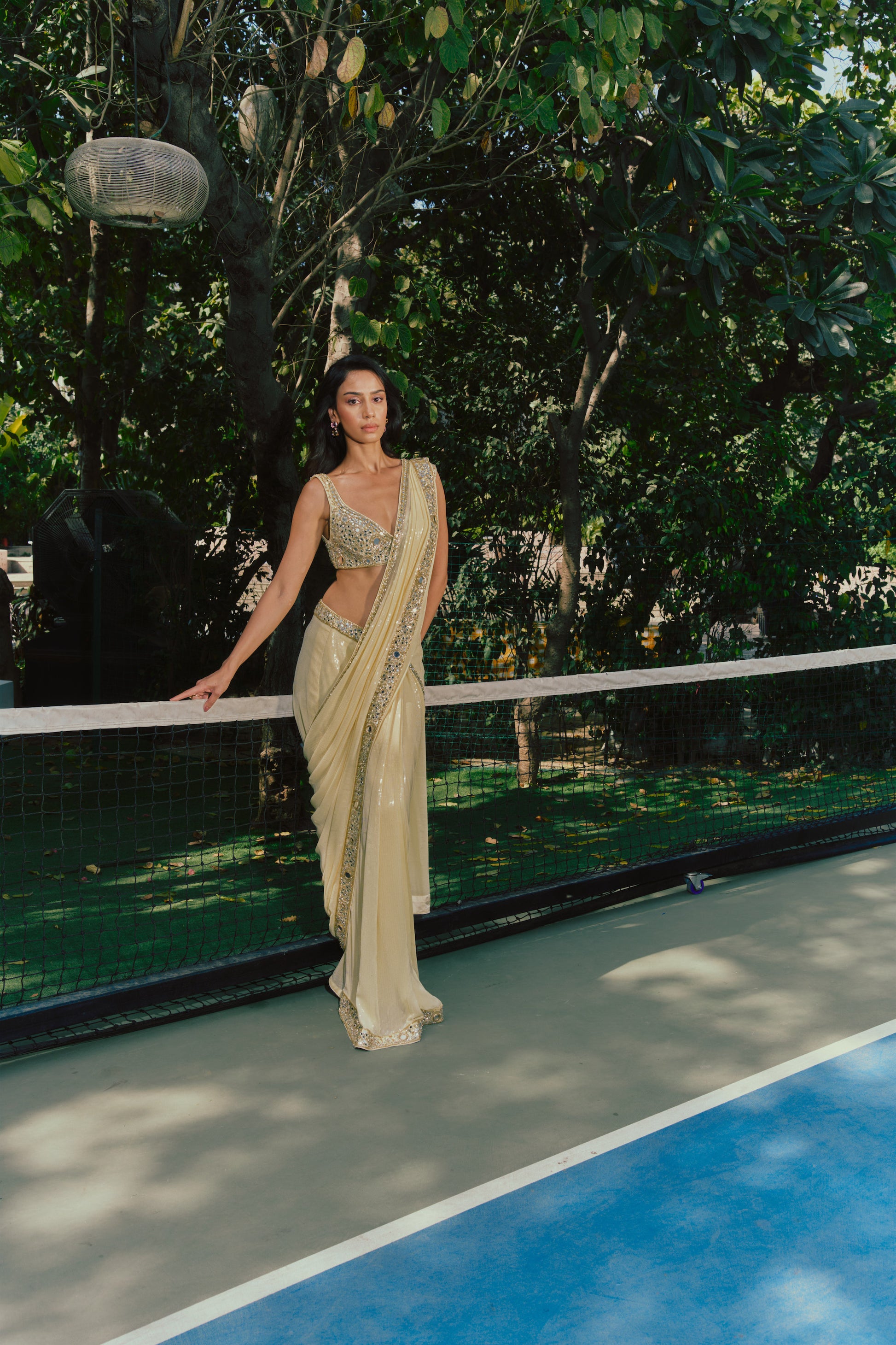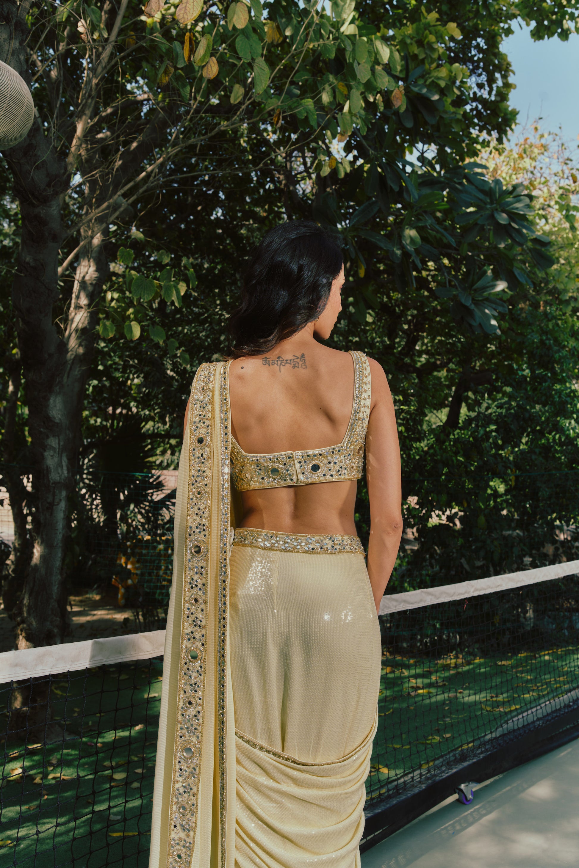 - A pre-draped sequin saree, designed for effortless wear and fluid movement. The silhouette is worn like a skirt, finished with a concealed side zip.