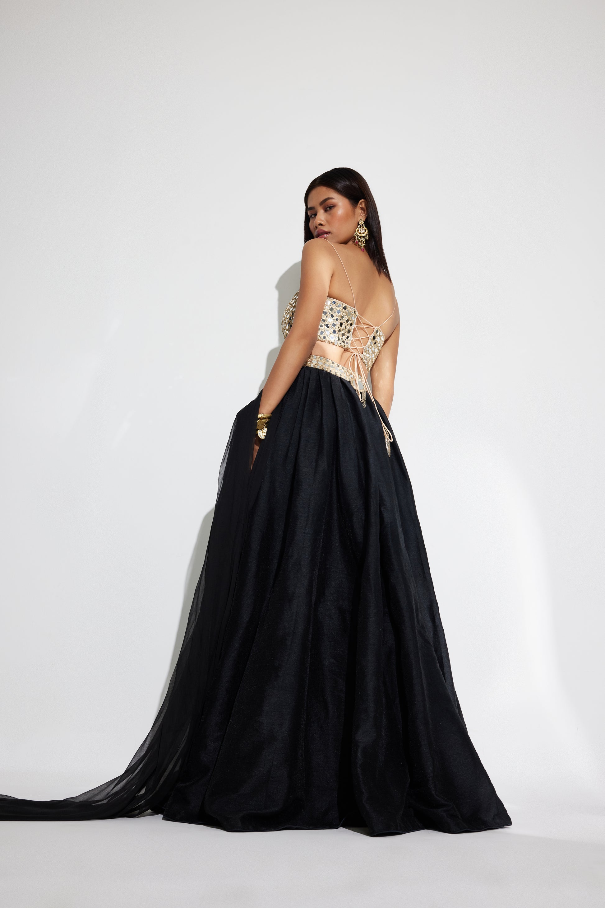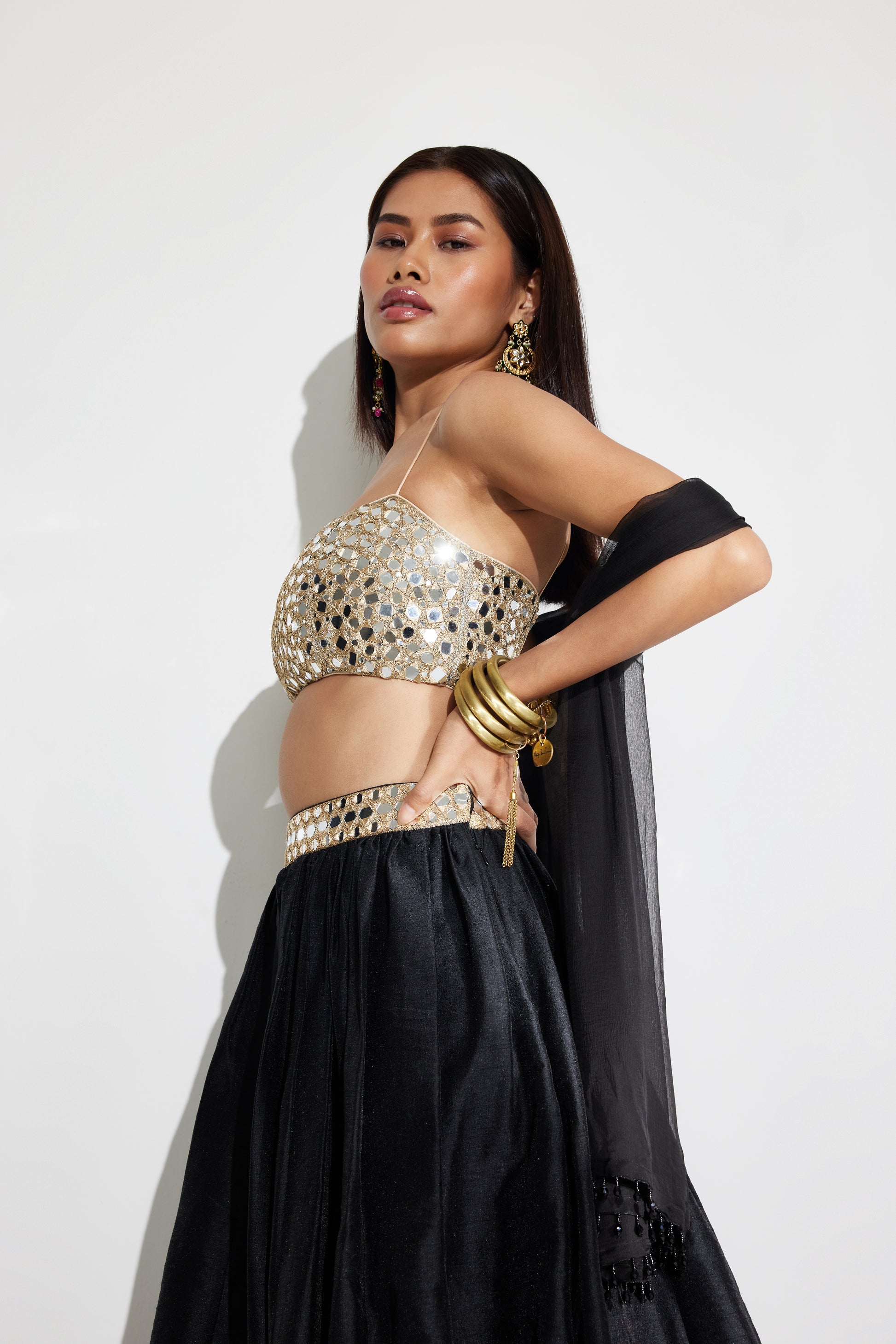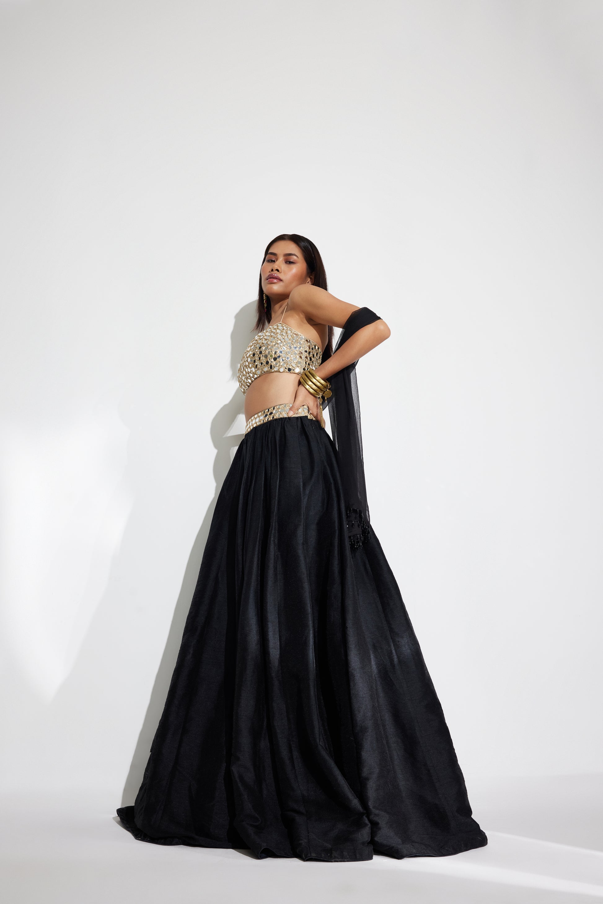 - Black raw silk lehenga set featuring mirror and zari hand embroidery on the blouse and belt.