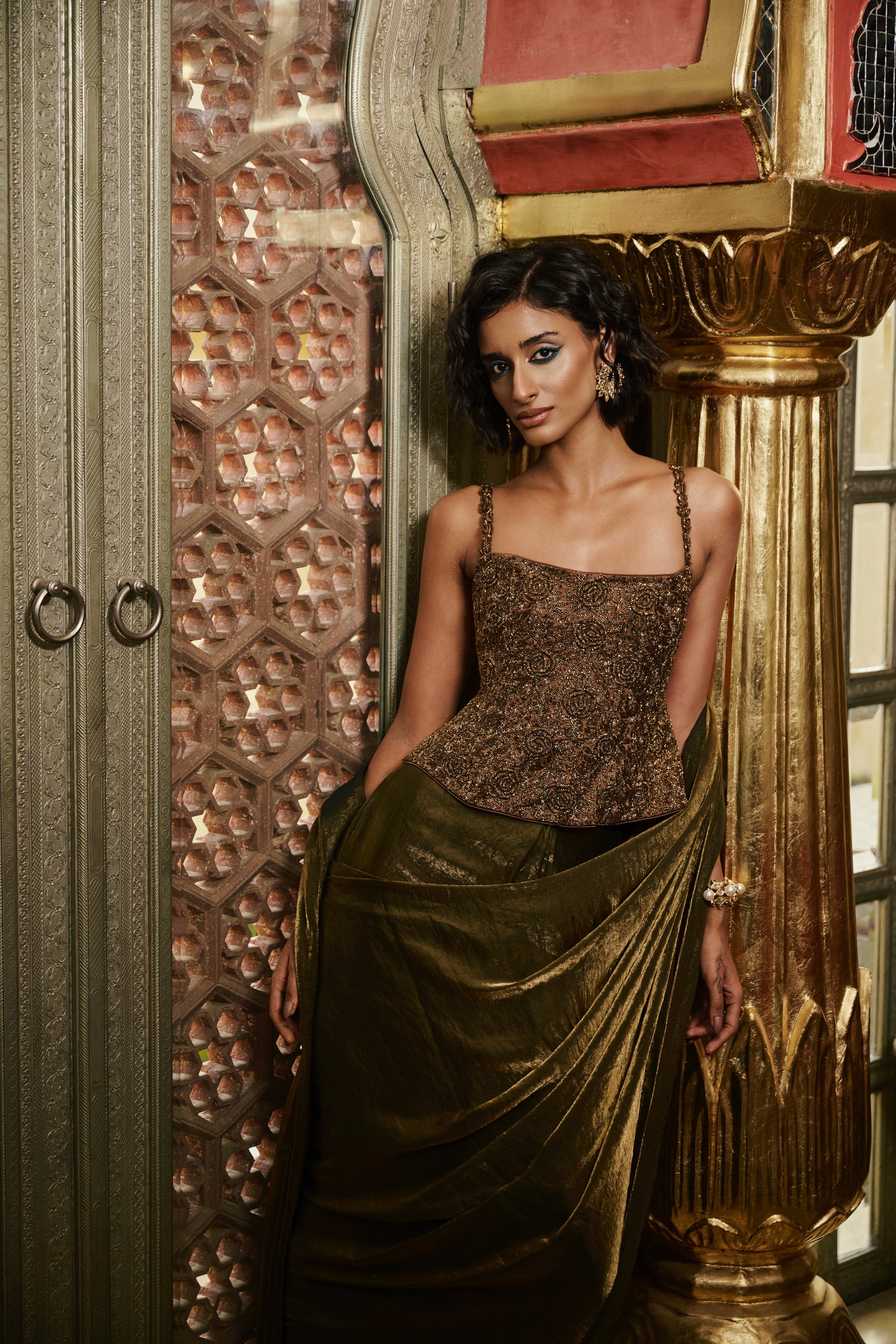- Pre-draped bronze saree with a hand-embroidered cut dana corset