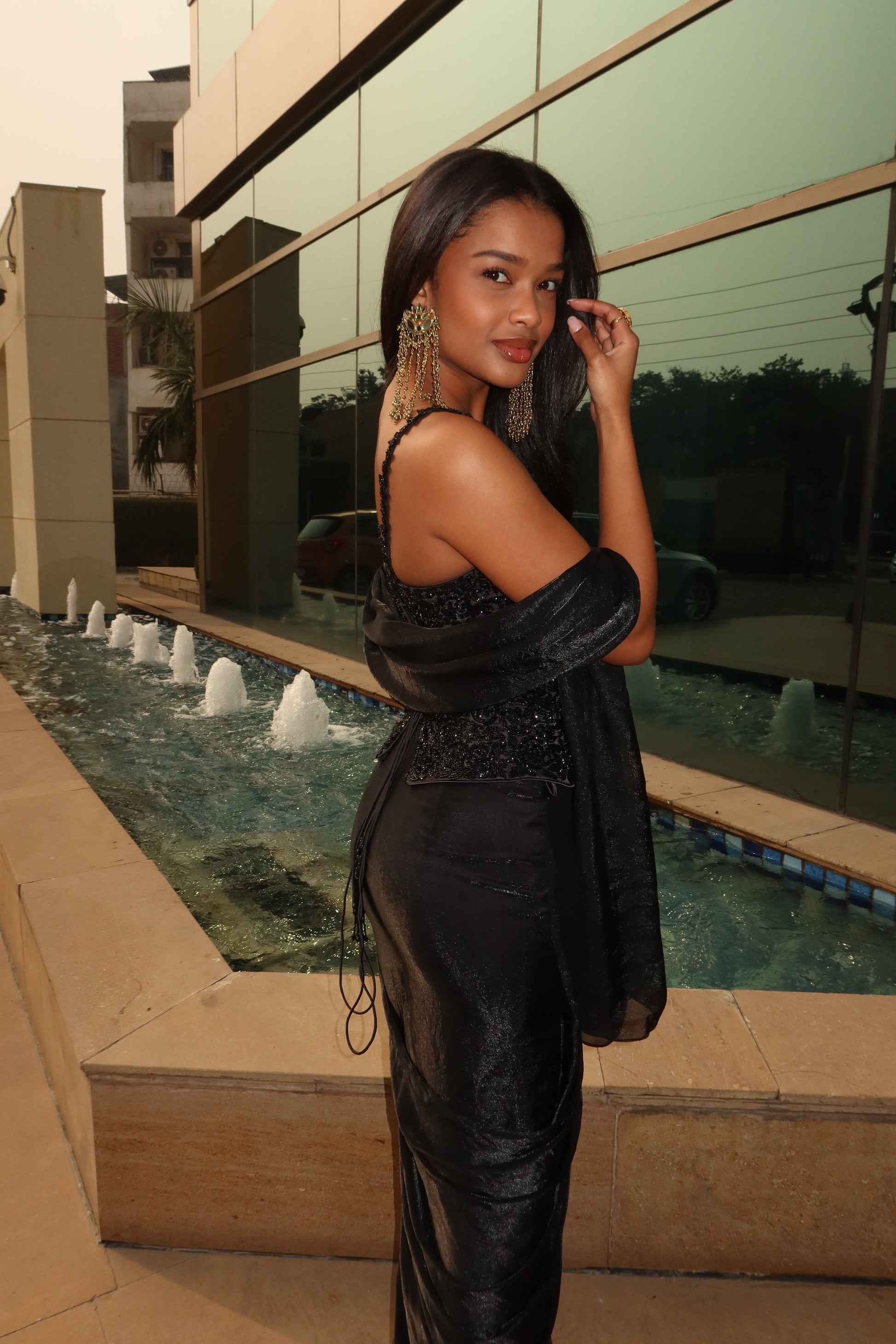 - Pre-draped black saree with a hand-embroidered cut dana corset
