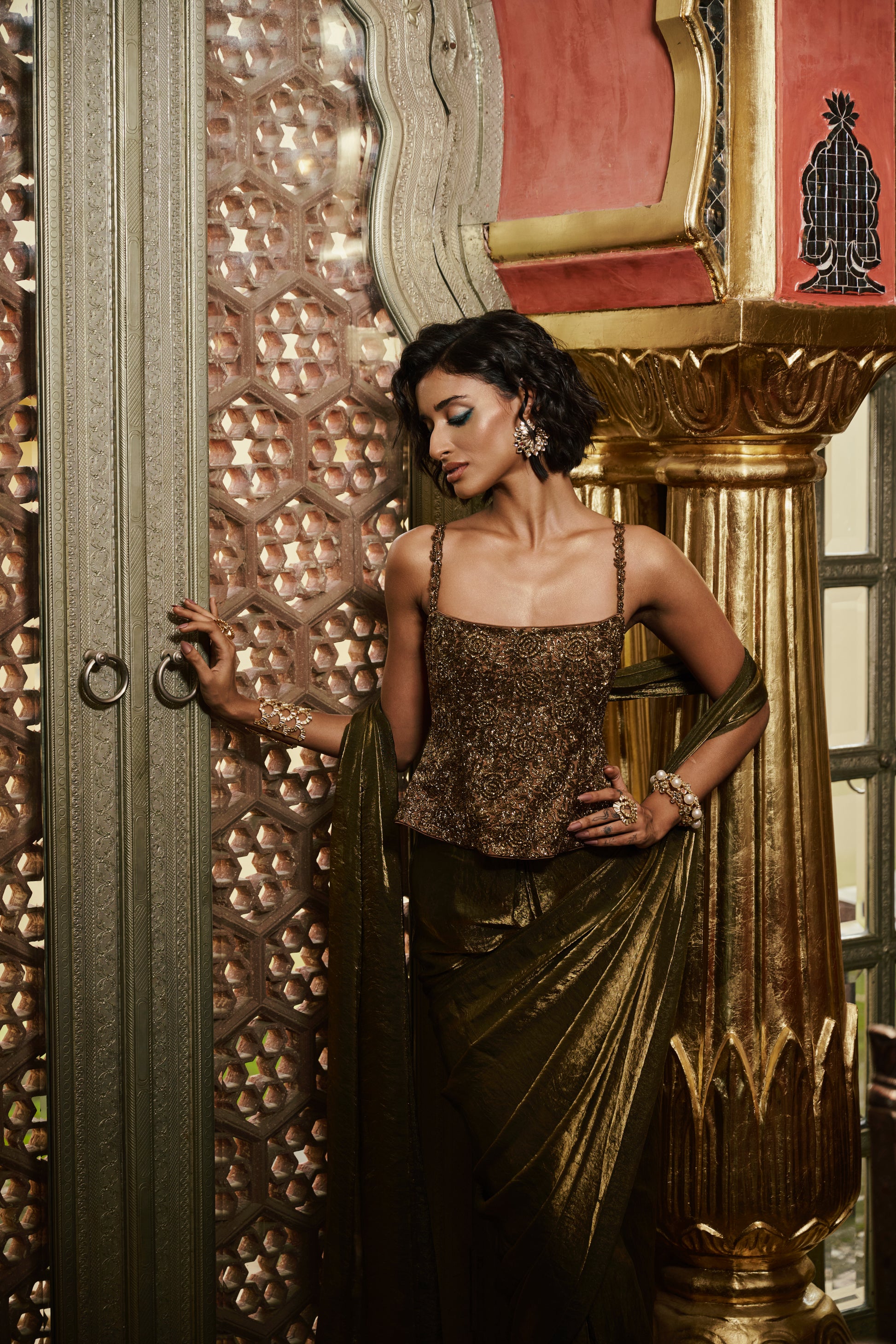 - The corset features intricate cut dana floral embroidery from top to bottom. It also includes embroidered straps and has drawstrings at the back for you to adjust the fit. (contact us at +91 9220824049 to customize the neckline)
