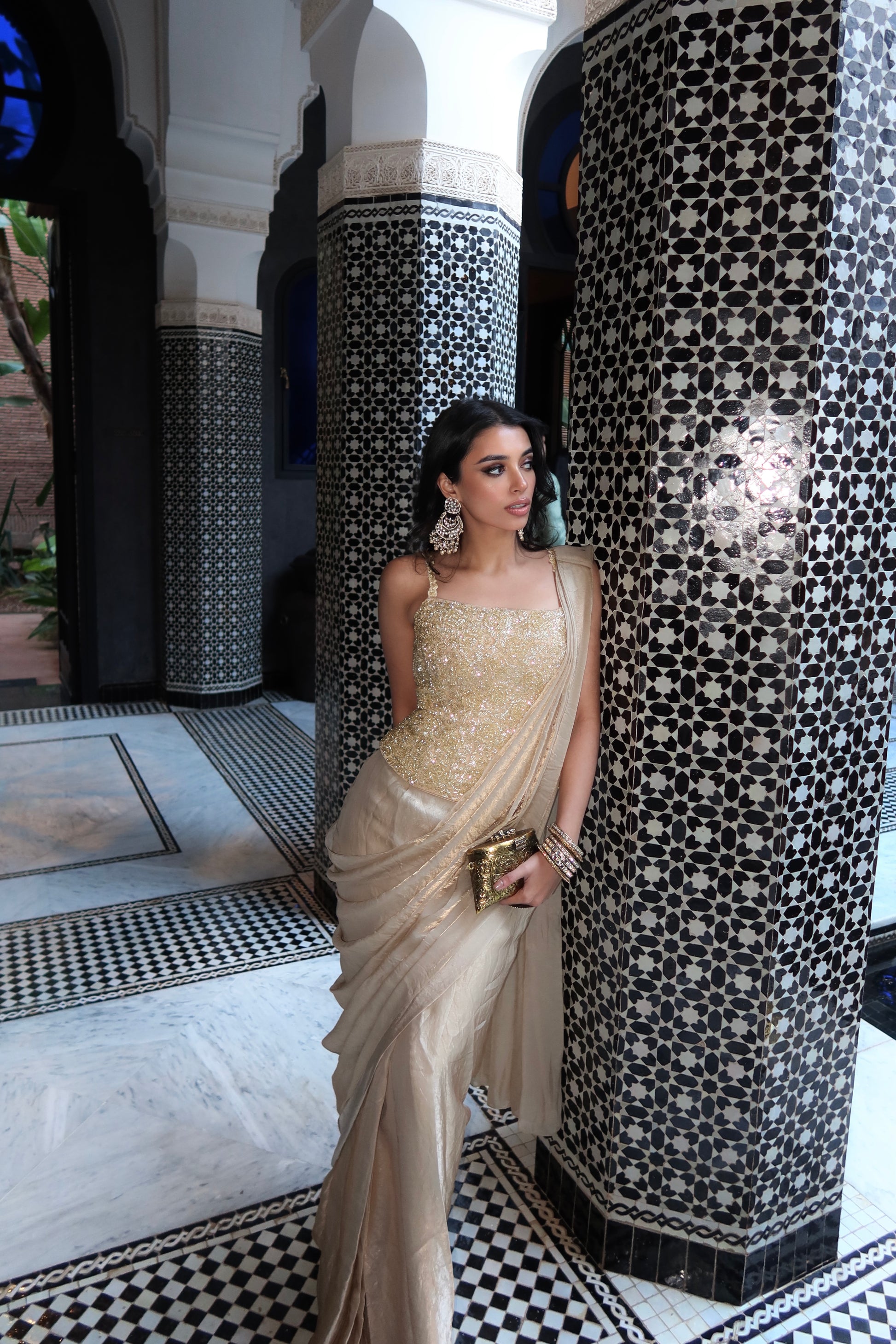 - Pre-draped light gold saree with a hand-embroidered cut dana corset